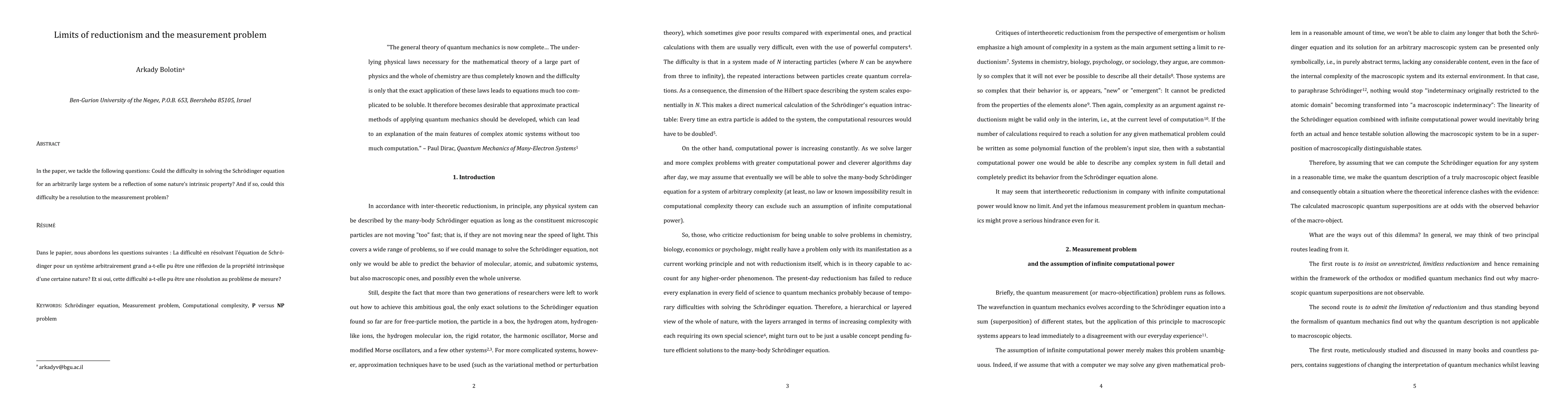 This paper investigates whether the difficulty in solving the Schrödinger equation for large systems is due to an intrinsic property or a limitation of reductionism, with potential implications for resolving the measurement problem in quantum mechanics.