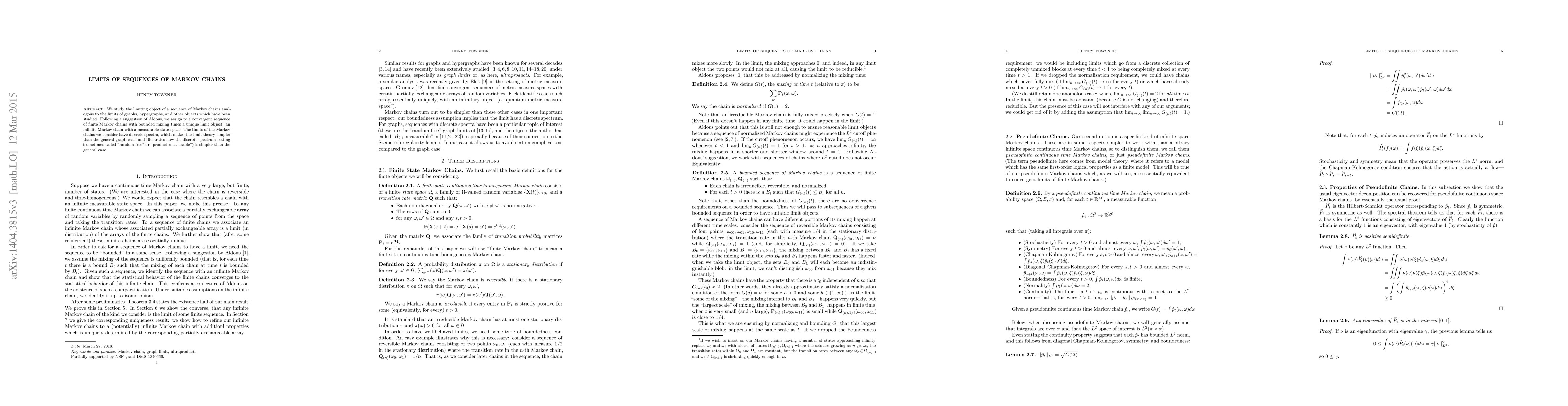 We study the limiting object of a sequence of Markov chains analogous to the limits of graphs, hypergraphs, and other objects which have been studied. Following a suggestion of Aldous, we assign to a sequence of finite Markov chains with bounded mixing times a unique limit object: an infinite Markov chain with a measurable state space. The limits of the Markov chains we consider have discrete spectra, which makes the limit theory simpler than the general graph case, and illustrates how the discrete spectrum setting (sometimes called "random-free" or "product measurable") is simpler than the general case.