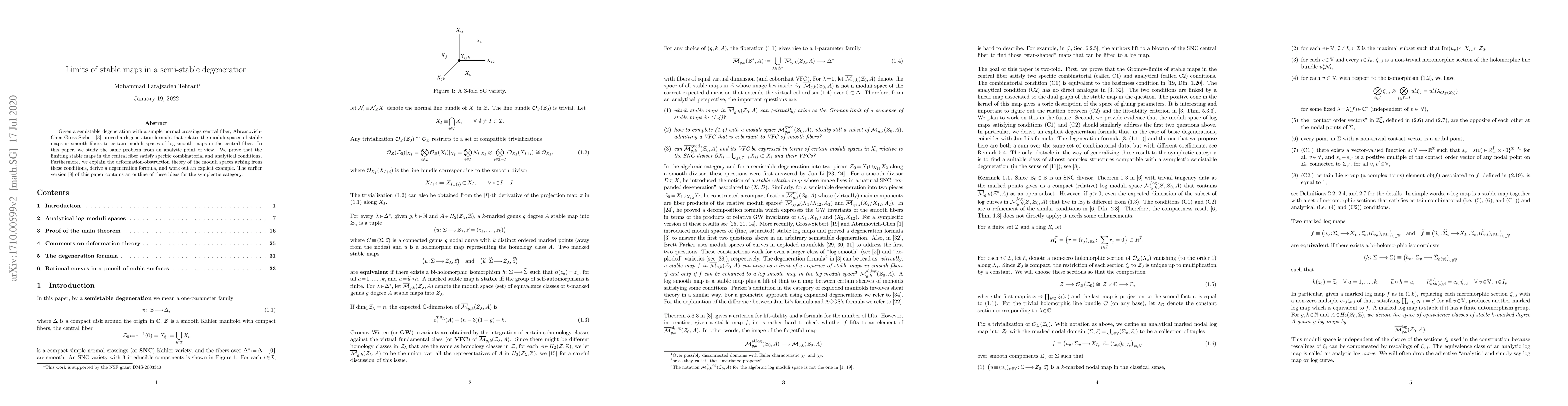 This paper investigates the analytic properties of stable maps in semistable degenerations with simple normal crossings central fibers, proving specific conditions for limiting stable maps. It develops a deformation-obstruction theory, derives a new degeneration formula, and provides an explicit example, extending prior work on the symplectic category.