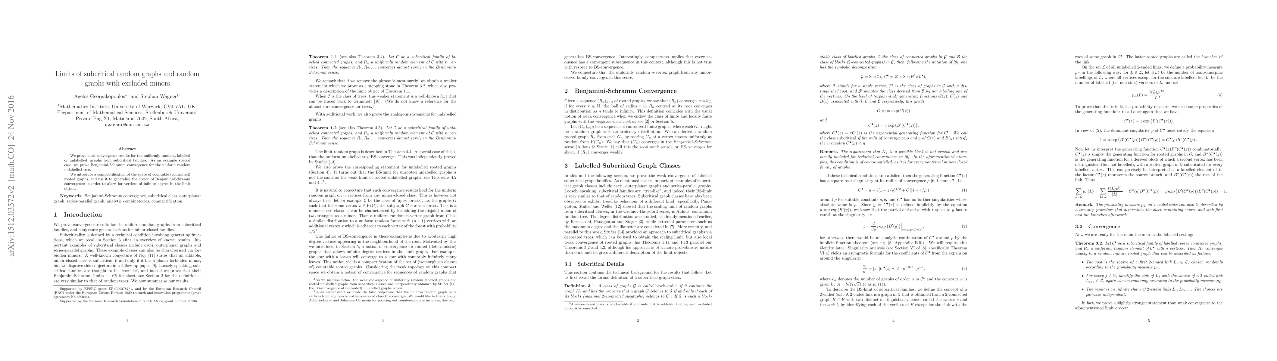 The paper proves local convergence results for uniformly random, labelled or unlabelled, graphs from subcritical families using a compactification of the space of countable (connected) rooted graphs and generalizing Benjamini-Schramm convergence to allow for vertices of infinite degree in the limit object.