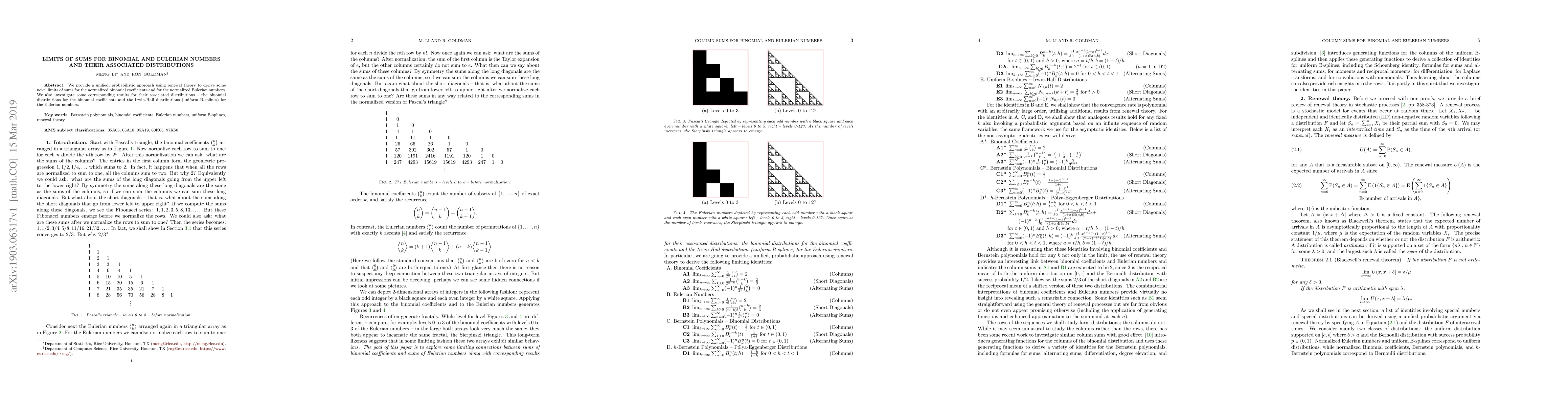 We provide a unified, probabilistic approach using renewal theory to derive some novel limits of sums for the normalized binomial coefficients and for the normalized Eulerian numbers. We also investigate some corresponding results for their associated distributions -- the binomial distributions for the binomial coefficients and the Irwin-Hall distributions (uniform B-splines) for the Eulerian numbers.