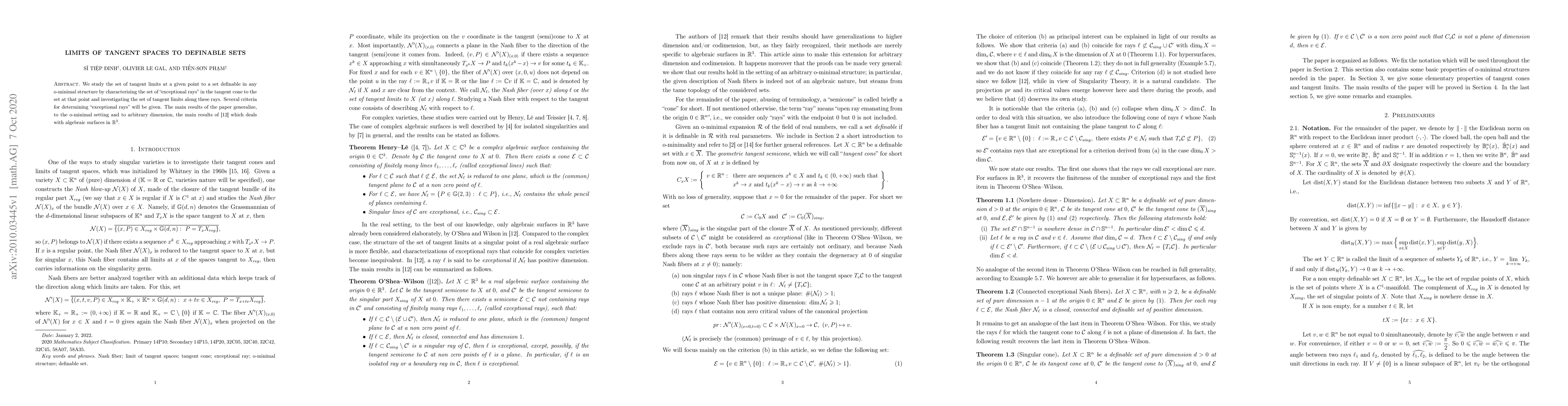 This paper studies the limits of tangent spaces to definable sets in o-minimal structures, generalizing a previous result for algebraic surfaces to arbitrary dimension.
