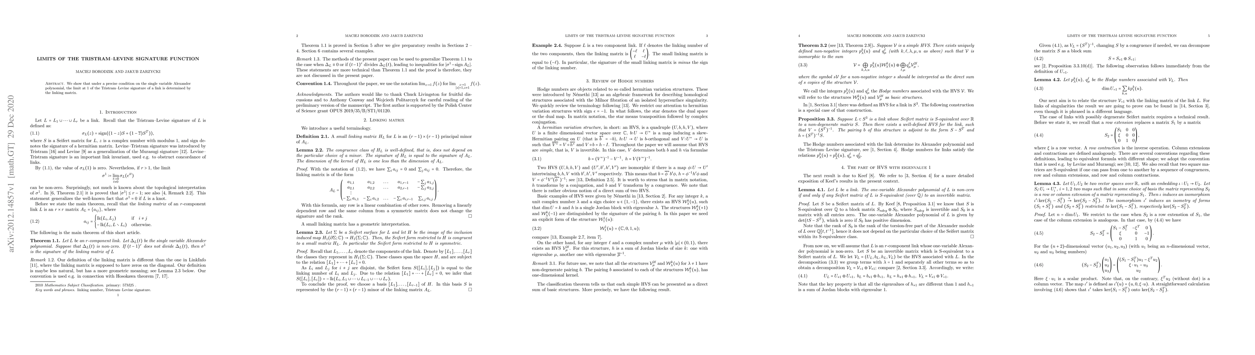 Summary: This paper demonstrates that when a specific condition on the Alexander polynomial is met, the limit of the Tristram-Levine signature of a link as it approaches $1$ is determined by the link's linking matrix.