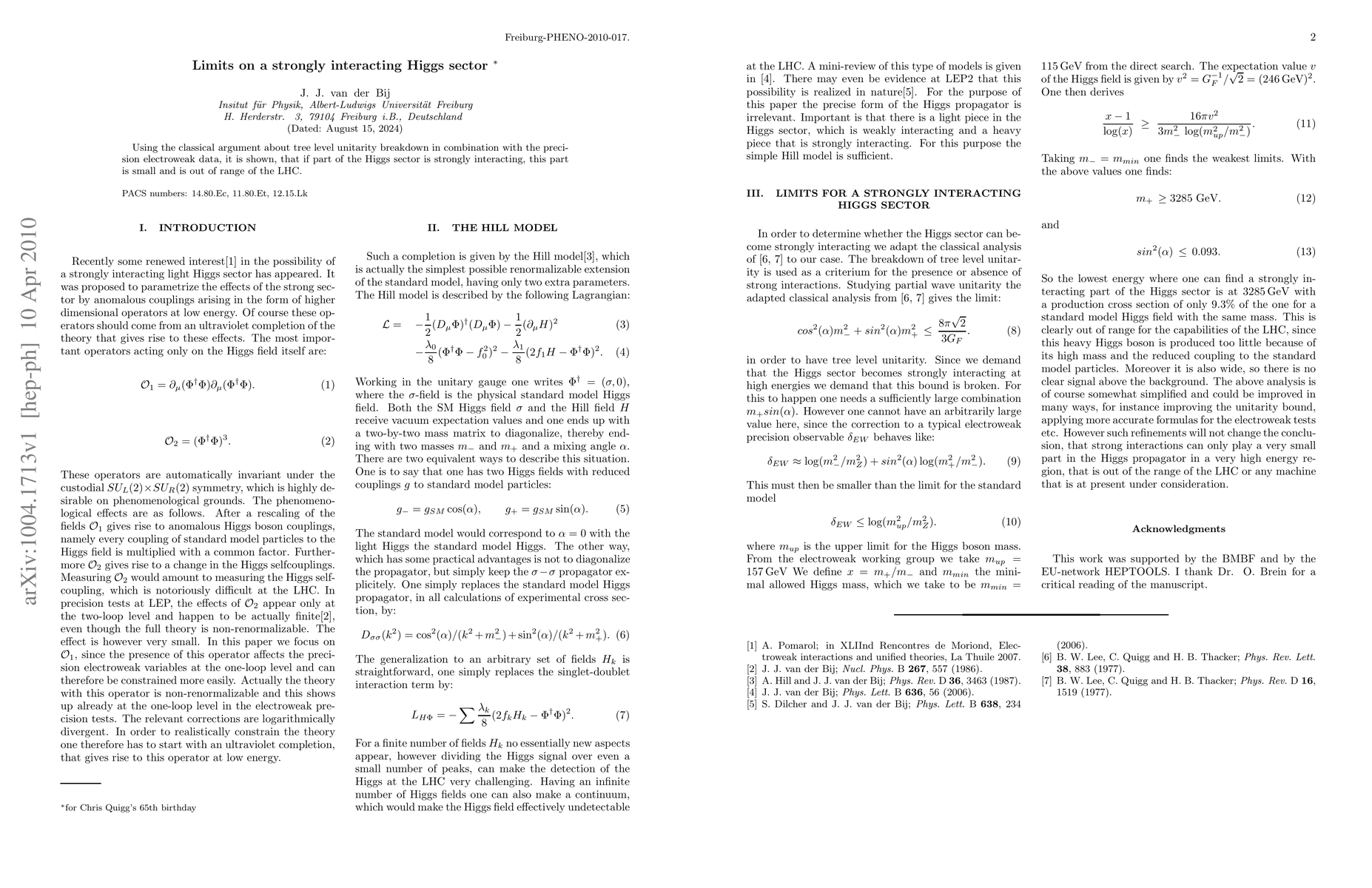 Using the classical argument about tree level unitarity breakdown in combination with the precision electroweak data, it is shown, that if part of the Higgs sector is strongly interacting, this part is small and is out of range of the LHC.