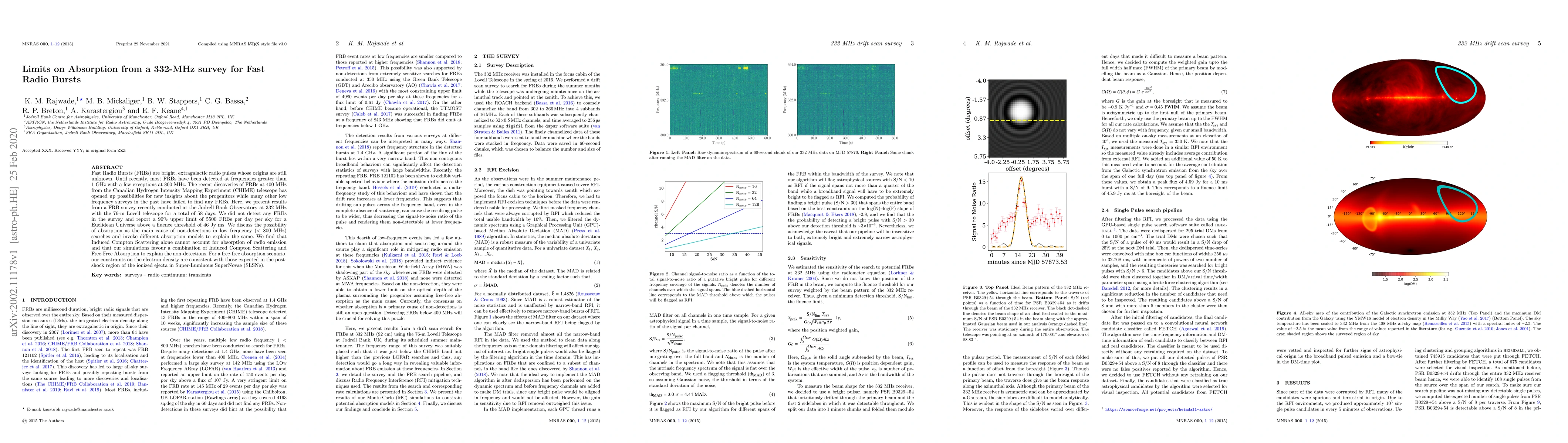 Fast Radio Bursts (FRBs) are bright, extragalactic radio pulses whose origins are still unknown. Until recently, most FRBs have been detected at frequencies greater than 1 GHz with a few exceptions at 800 MHz. The recent discoveries of FRBs at 400 MHz from the Canadian Hydrogen Intensity Mapping Experiment (CHIME) telescope has opened up possibilities for new insights about the progenitors while many other low frequency surveys in the past have failed to find any FRBs. Here, we present results from a FRB survey recently conducted at the Jodrell Bank Observatory at 332 MHz with the 76-m Lovell telescope for a total of 58 days. We did not detect any FRBs in the survey and report a 90$\%$ upper limit of 5500 FRBs per day per sky for a Euclidean Universe above a fluence threshold of 46 Jy ms. We discuss the possibility of absorption as the main cause of non-detections in low frequency (< 800 MHz) searches and invoke different absorption models to explain the same. We find that Induced Compton Scattering alone cannot account for absorption of radio emission and that our simulations favour a combination of Induced Compton Scattering and Free-Free Absorption to explain the non-detections. For a free-free absorption scenario, our constraints on the electron density are consistent with those expected in the post-shock region of the ionized ejecta in Super-Luminous SuperNovae (SLSNe).
