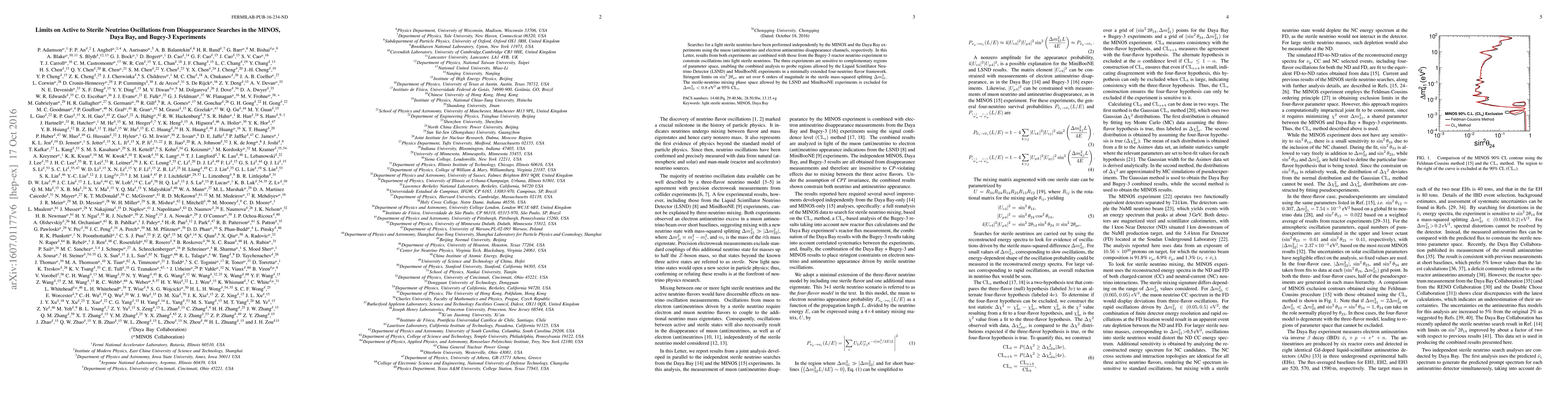 This paper combines results from MINOS, Daya Bay, and Bugey-3 experiments to constrain light sterile neutrino oscillations, setting stringent limits on $\sin^2 2\theta_{\mu e}$ over a wide range of $\Delta m^2_{41}$. The analysis excludes the mixing phase space allowed by LSND and MiniBooNE for $\Delta m^2_{41} < 0.8$ eV$^2$ at 95% confidence level.