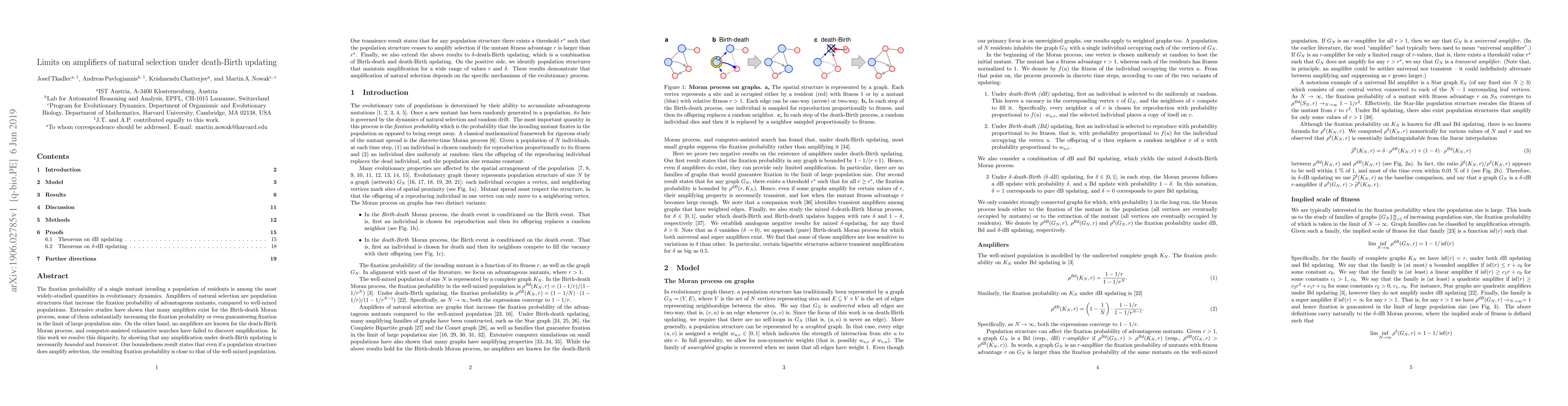 This paper demonstrates that amplifiers of natural selection are limited under death-Birth updating in evolutionary dynamics, showing that any amplification is bounded and transient. It concludes that while some population structures can maintain amplification for a wide range of fitness advantages, the overall effect remains close to that of well-mixed populations.
