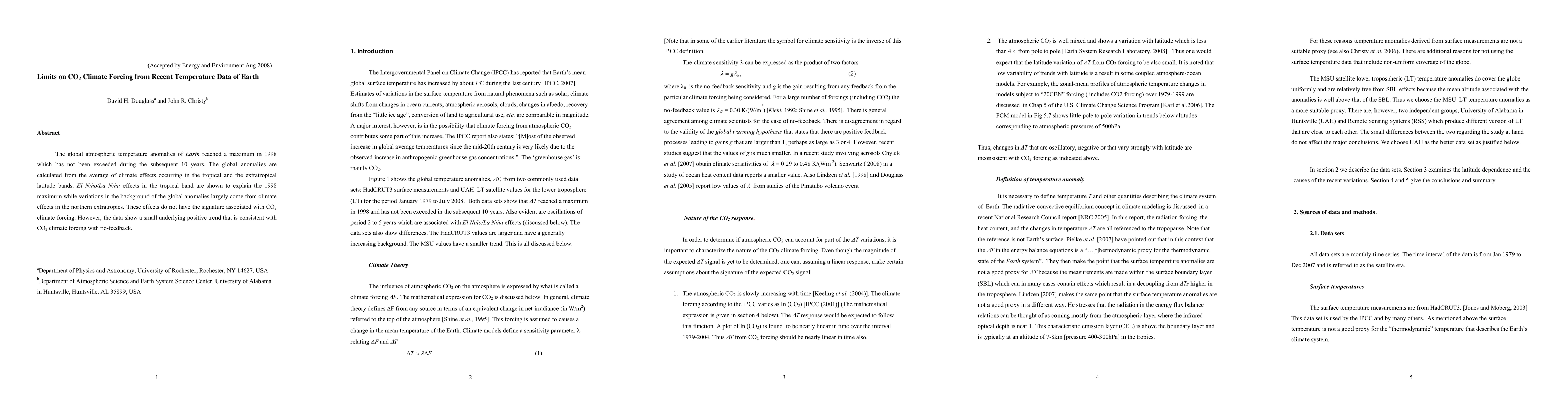This paper finds that despite a 1998 peak in global temperature anomalies, no subsequent increase has occurred over the past decade, attributing the peak to El Nino/La Nina effects. It concludes that while there is a small underlying positive trend consistent with CO2 forcing, it does not exhibit the signature of feedback mechanisms.