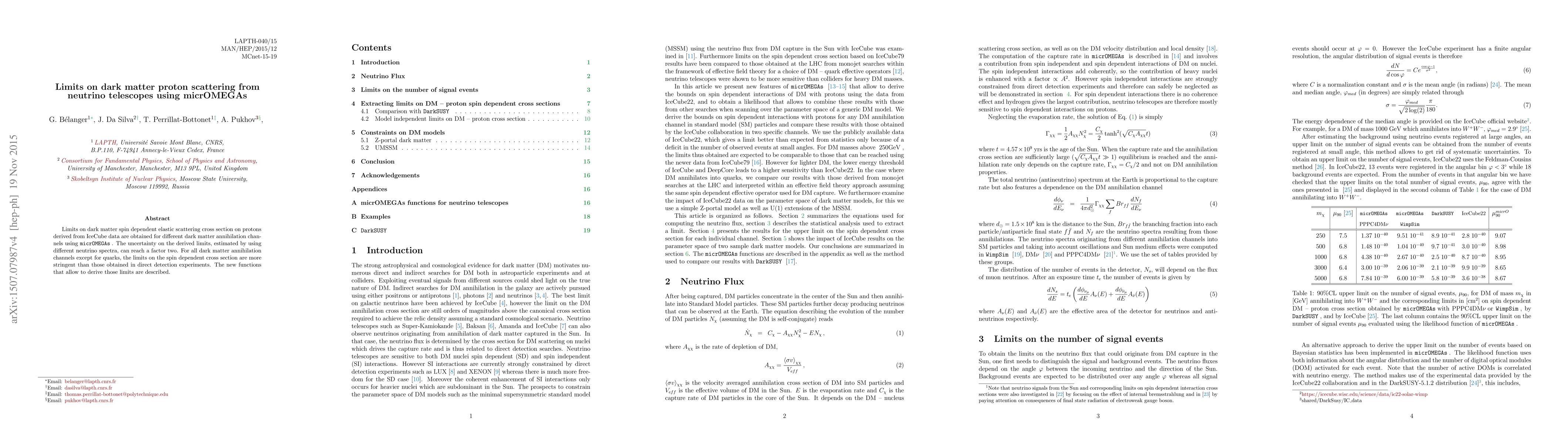 This paper derives stringent limits on dark matter's spin-dependent elastic scattering cross section on protons using IceCube data and micrOMEGAs, surpassing direct detection experiments for most dark matter annihilation channels except quarks. The uncertainty in these limits can vary by a factor of two depending on the neutrino spectra used.
