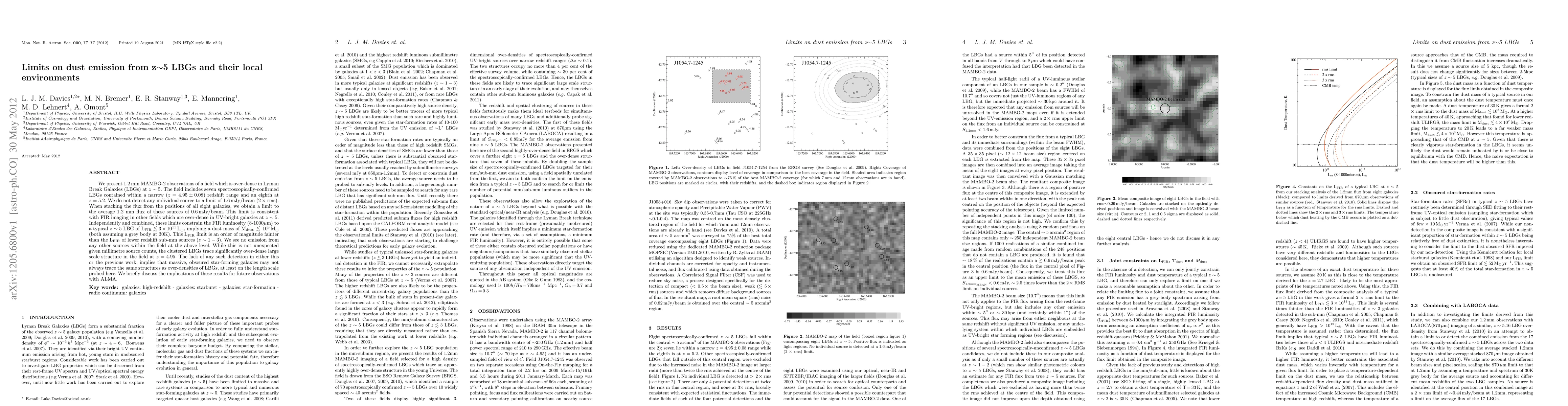 We present 1.2mm MAMBO-2 observations of a field which is over-dense in Lyman Break Galaxies (LBGs) at z~5. The field includes seven spectroscopically-confirmed LBGs contained within a narrow (z=4.95+/-0.08) redshift range and an eighth at z=5.2. We do not detect any individual source to a limit of 1.6 mJy/beam (2*rms). When stacking the flux from the positions of all eight galaxies, we obtain a limit to the average 1.2 mm flux of these sources of 0.6mJy/beam. This limit is consistent with FIR imaging in other fields which are over-dense in UV-bright galaxies at z~5. Independently and combined, these limits constrain the FIR luminosity (8-1000 micron) to a typical z~5 LBG of LFIR<~3x10^11 Lsun, implying a dust mass of Mdust<~10^8 Msun (both assuming a grey body at 30K). This LFIR limit is an order of magnitude fainter than the LFIR of lower redshift sub-mm sources (z~1-3). We see no emission from any other sources within the field at the above level. While this is not unexpected given millimetre source counts, the clustered LBGs trace significantly over-dense large scale structure in the field at z = 4.95. The lack of any such detection in either this or the previous work, implies that massive, obscured star-forming galaxies may not always trace the same structures as over-densities of LBGs, at least on the length scale probed here. We briefly discuss the implications of these results for future observations with ALMA.
