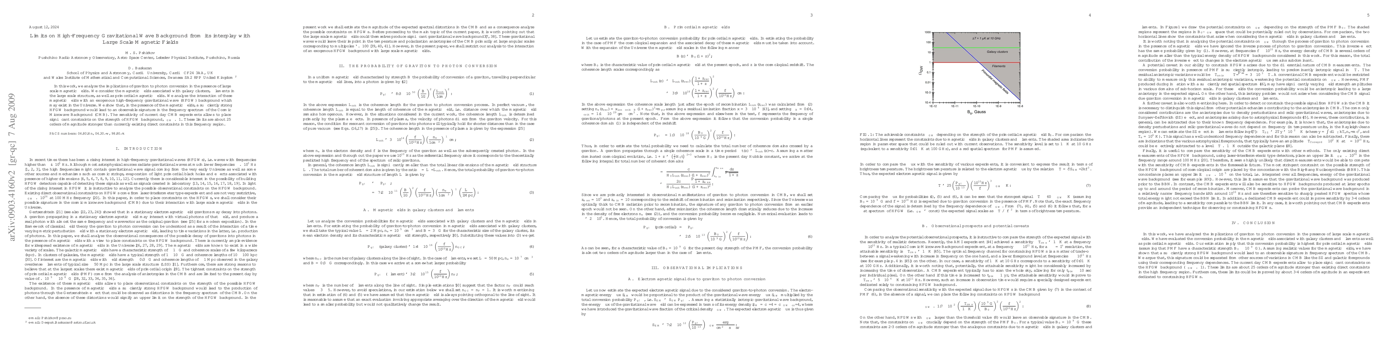 In this work, we analyze the implications of graviton to photon conversion in the presence of large scale magnetic fields. We consider the magnetic fields associated with galaxy clusters, filaments in the large scale structure, as well as primordial magnetic fields. {We analyze the interaction of these magnetic fields with an exogenous high-frequency gravitational wave (HFGW) background which may exist in the Universe. We show that, in the presence of the magnetic fields, a sufficiently strong HFGW background would lead to an observable signature in the frequency spectrum of the Cosmic Microwave Background (CMB).} The sensitivity of current day CMB experiments allows to place significant constraints on the strength of HFGW background, $\Omega_{GW}\lesssim1$. These limits are about 25 orders of magnitude stronger {than currently existing direct constraints} in this frequency region.