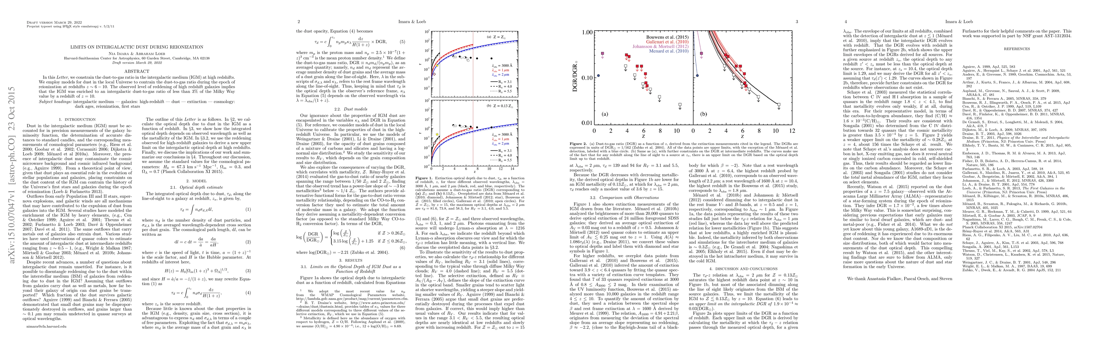 This paper constrains the dust-to-gas ratio in the intergalactic medium at high redshifts, finding it to be less than 3% of the Milky Way value by z=10, based on observed reddening of high redshift galaxies. The study uses models from the local Universe to extrapolate these conditions during the reionization epoch.