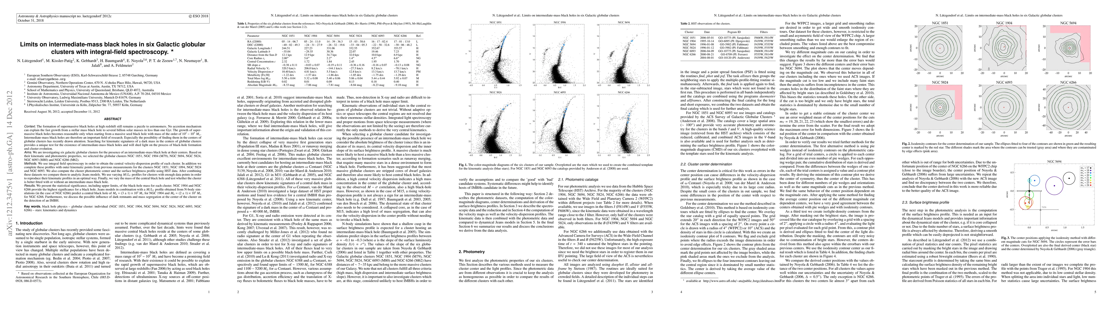This research investigates six Galactic globular clusters for intermediate-mass black holes (IMBHs) using integral-field spectroscopy. The study combines kinematic and photometric data from HST, models them with Jeans equations, and finds the highest significance for a black hole in NGC 1904 and NGC 6266, estimating their central black hole masses at (3 +- 1) x 10^3 M_SUN and (2 +- 1) x 10^3 M_SUN respectively.