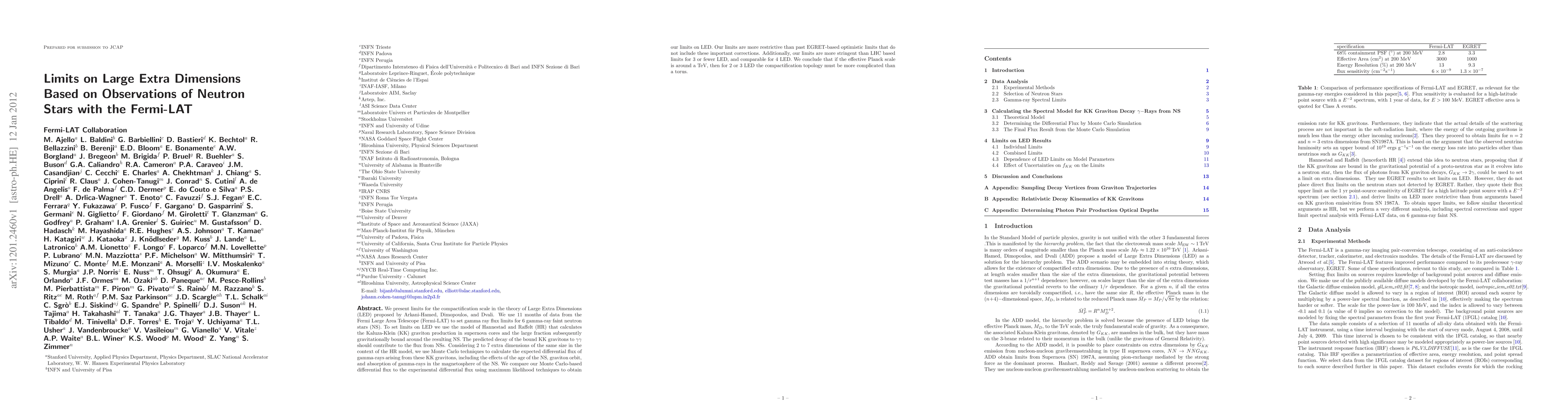 We present limits for the compactification scale in the theory of Large Extra Dimensions (LED) proposed by Arkani-Hamed, Dimopoulos, and Dvali. We use 11 months of data from the Fermi Large Area Telescope (Fermi-LAT) to set gamma ray flux limits for 6 gamma-ray faint neutron stars (NS). To set limits on LED we use the model of Hannestad and Raffelt (HR) that calculates the Kaluza-Klein (KK) graviton production in supernova cores and the large fraction subsequently gravitationally bound around the resulting NS. The predicted decay of the bound KK gravitons to {\gamma}{\gamma} should contribute to the flux from NSs. Considering 2 to 7 extra dimensions of the same size in the context of the HR model, we use Monte Carlo techniques to calculate the expected differential flux of gamma-rays arising from these KK gravitons, including the effects of the age of the NS, graviton orbit, and absorption of gamma-rays in the magnetosphere of the NS. We compare our Monte Carlo-based differential flux to the experimental differential flux using maximum likelihood techniques to obtain our limits on LED. Our limits are more restrictive than past EGRET-based optimistic limits that do not include these important corrections. Additionally, our limits are more stringent than LHC based limits for 3 or fewer LED, and comparable for 4 LED. We conclude that if the effective Planck scale is around a TeV, then for 2 or 3 LED the compactification topology must be more complicated than a torus.