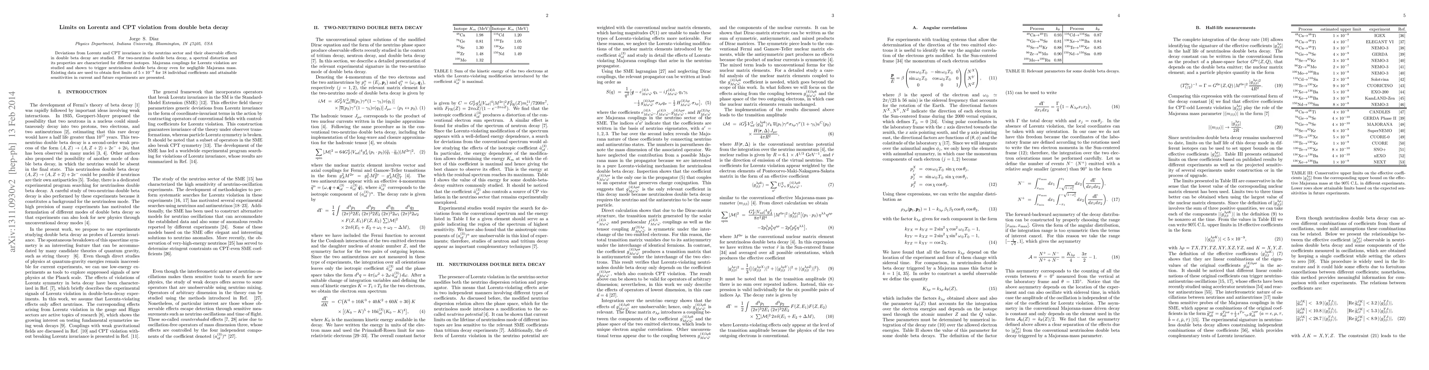 Deviations from Lorentz and CPT invariance in the neutrino sector and their observable effects in double beta decay are studied. For two-neutrino double beta decay, a spectral distortion and its properties are characterized for different isotopes. Majorana couplings for Lorentz violation are studied and shown to trigger neutrinoless double beta decay even for negligible Majorana mass. Existing data are used to obtain first limits of $5 \times 10^{-9}$ for 18 individual coefficients and attainable sensitivities in current and future experiments are presented.