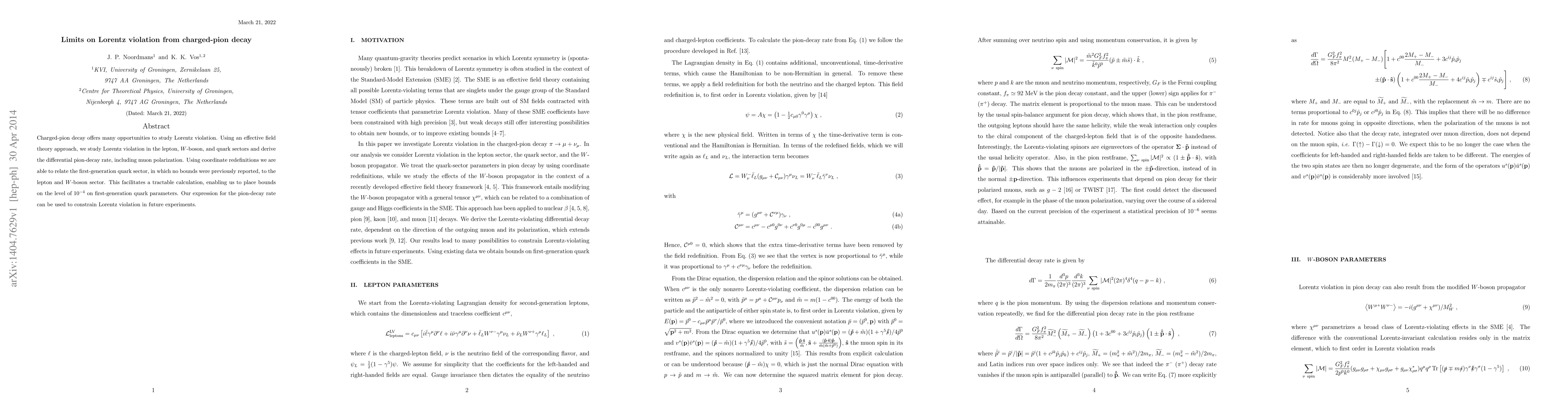 Charged-pion decay offers many opportunities to study Lorentz violation. Using an effective field theory approach, we study Lorentz violation in the lepton, W-boson, and quark sectors and derive the differential pion-decay rate, including muon polarization. Using coordinate redefinitions we are able to relate the first-generation quark sector, in which no bounds were previously reported, to the lepton and W-boson sector. This facilitates a tractable calculation, enabling us to place bounds on the level of $10^{-4}$ on first-generation quark parameters. Our expression for the pion-decay rate can be used to constrain Lorentz violation in future experiments.