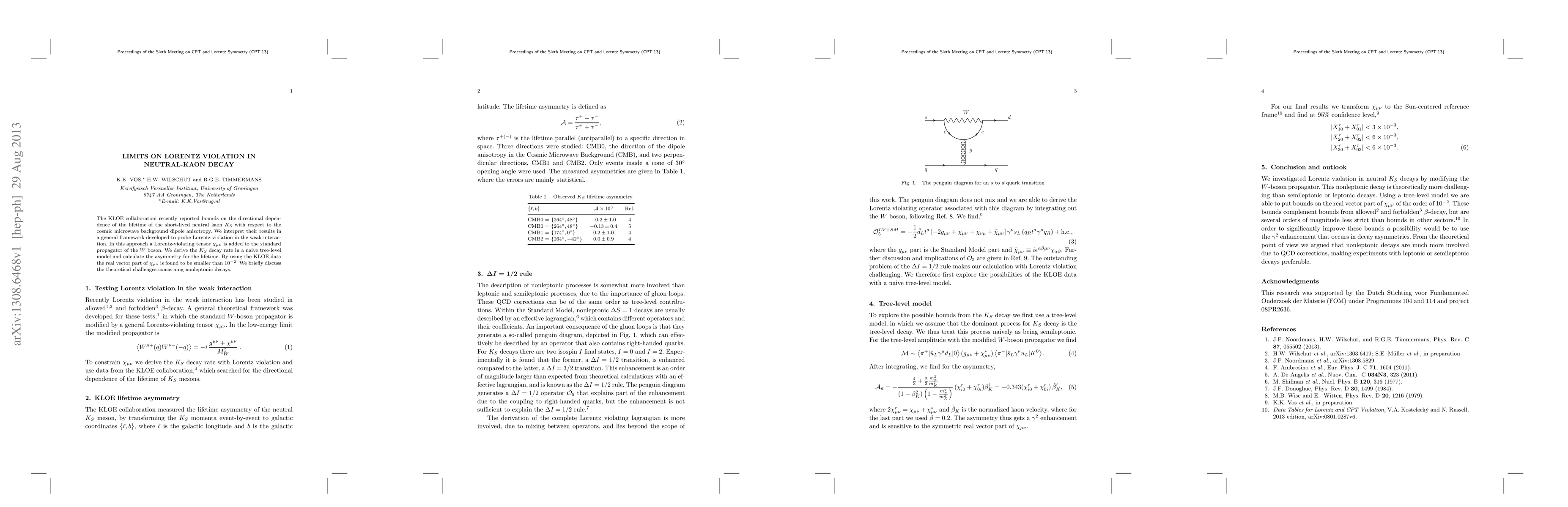 The KLOE collaboration recently reported bounds on the directional dependence of the lifetime of the short-lived neutral kaon K_S with respect to the cosmic microwave background dipole anisotropy. We interpret their results in a general framework developed to probe Lorentz violation in the weak interaction. In this approach a Lorentz-violating tensor \chi_{\mu\nu} is added to the standard propagator of the W boson. We derive the K_S decay rate in a naive tree-level model and calculate the asymmetry for the lifetime. By using the KLOE data the real vector part of \chi_{\mu\nu} is found to be smaller than 10^-2. We briefly discuss the theoretical challenges concerning nonleptonic decays.