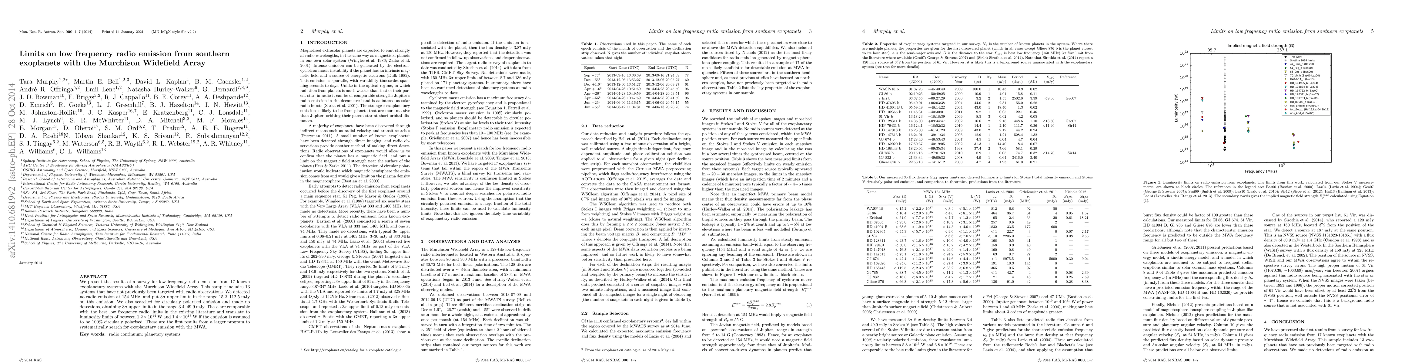This study uses the Murchison Widefield Array to survey 17 exoplanetary systems for low-frequency radio emissions, detecting none and setting upper limits on potential emissions. These results provide new constraints on the radio luminosity of exoplanets.