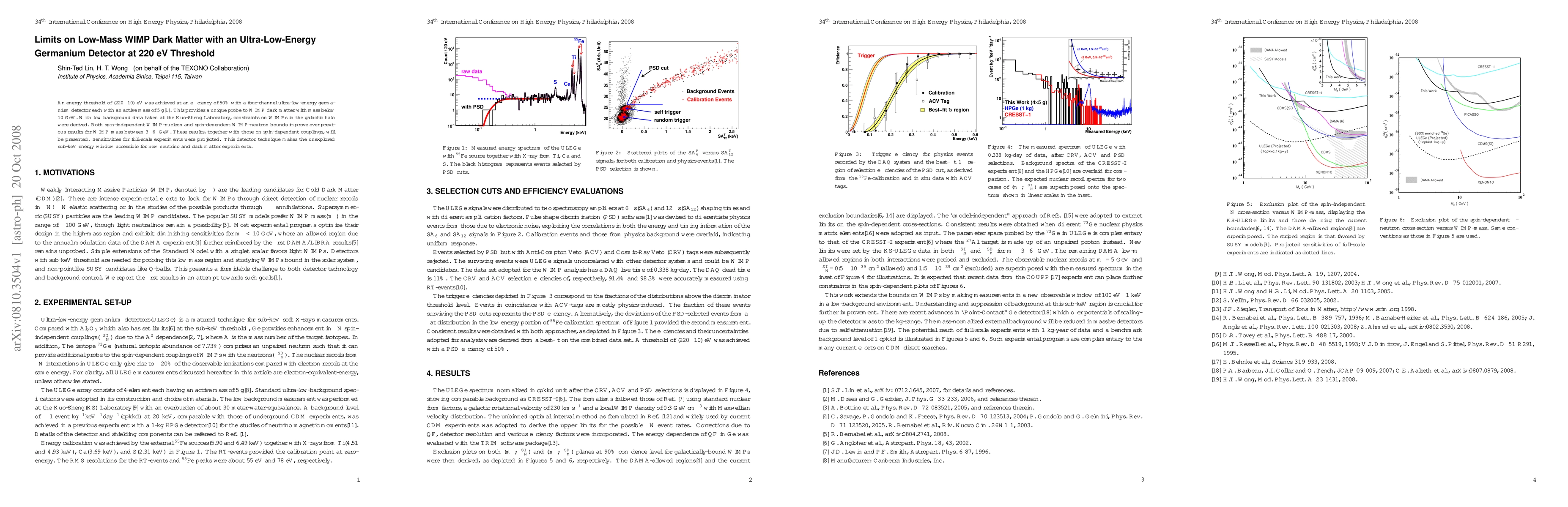 An energy threshold of (220$\pm$10) eV was achieved at an efficiency of 50% with a four-channel ultra-low-energy germanium detector each with an active mass of 5 g\cite{wimppaper}. This provides a unique probe to WIMP dark matter with mass below 10 GeV. With low background data taken at the Kuo-Sheng Laboratory, constraints on WIMPs in the galactic halo were derived. Both spin-independent WIMP-nucleon and spin-dependent WIMP-neutron bounds improve over previous results for WIMP mass between 3$-$6 GeV. These results, together with those on spin-dependent couplings, will be presented. Sensitivities for full-scale experiments were projected. This detector technique makes the unexplored sub-keV energy window accessible for new neutrino and dark matter experiments.