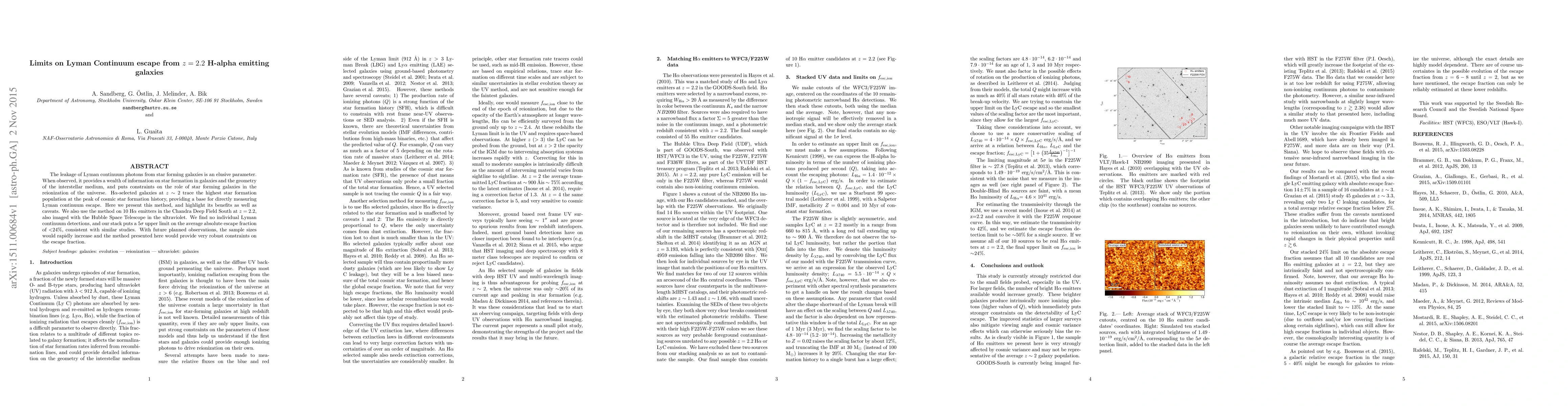 This study investigates Lyman continuum photon leakage from H-alpha-selected galaxies at z=2.2, finding no individual detections and setting a 5 sigma upper limit on the average escape fraction at <24%. The method promises robust constraints on future larger samples.