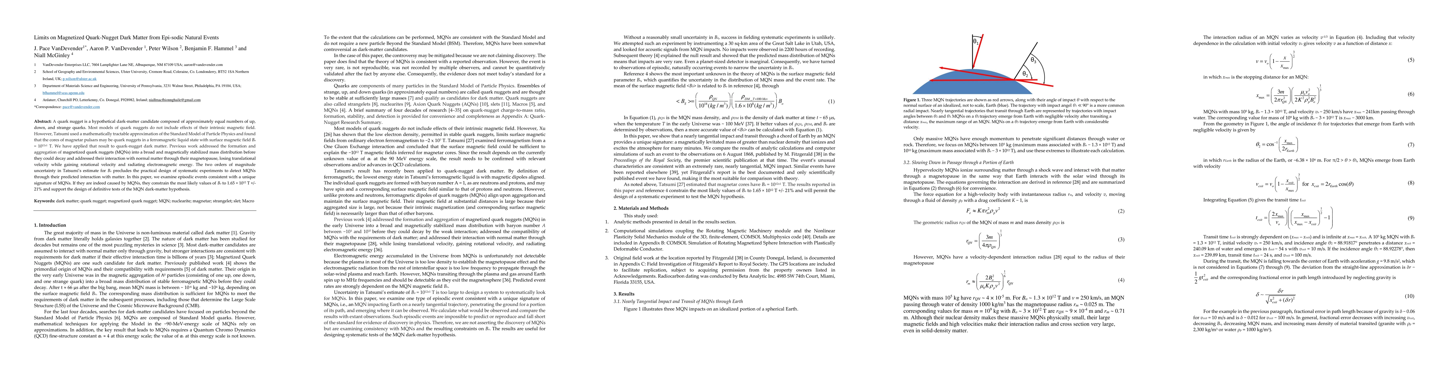 A quark nugget is a hypothetical dark-matter candidate composed of approximately equal numbers of up, down, and strange quarks. Most models of quark nuggets do not include effects of their intrinsic magnetic field. However, Tatsumi used a mathematically tractable approximation of the Standard Model of Particle Physics and found that the cores of magnetar pulsars may be quark nuggets in a ferromagnetic liquid state with surface magnetic field Bo between $10^{ 11}$ T and $10^{ 13}$ T. We have applied that result to quark-nugget dark matter. Previous work addressed the formation and aggregation of magnetized quark nuggets (MQNs) into a broad and magnetically stabilized mass distribution before they could decay and addressed their interaction with normal matter through their magnetopause, losing translational velocity while gaining rotational velocity and radiating electromagnetic energy. The two orders of magnitude uncertainty in Tatsumi estimate for Bo precludes the practical design of systematic experiments to detect MQNs through their predicted interaction with matter. In this paper, we examine episodic events consistent with a unique signature of MQNs. If they are indeed caused by MQNs, they constrain the most likely values of Bo to $1.65 x 10^{ 12}$ T $+/-$ $21\%$ and support the design of definitive tests of the MQN dark-matter hypothesis.