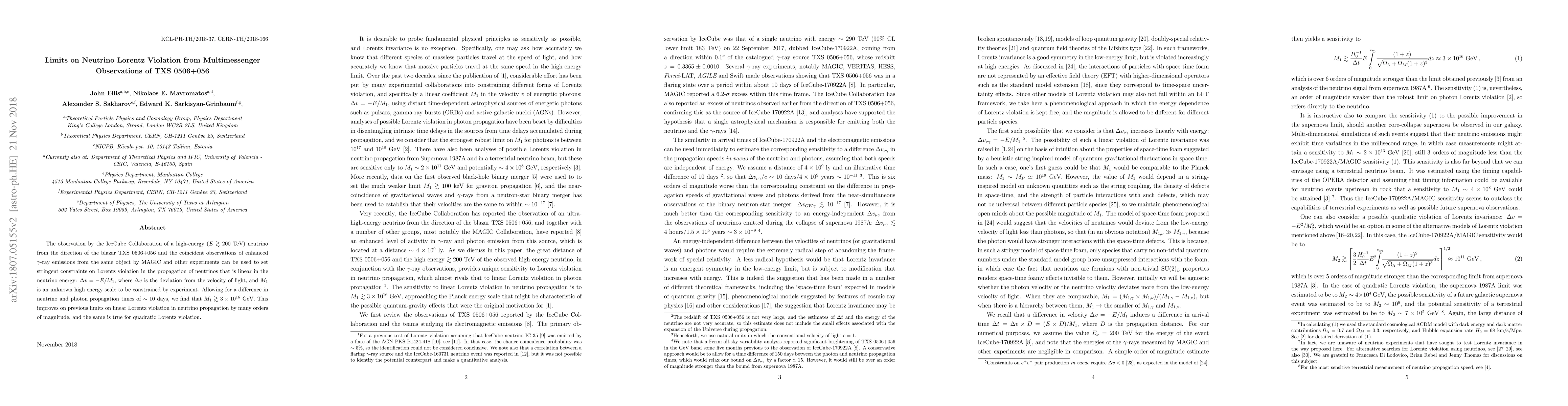 This paper sets new limits on neutrino Lorentz violation using multimessenger observations of the blazar TXS 0506+056, finding $M_1 \gtrsim 3 \times 10^{16}$ GeV for linear Lorentz violation, significantly improving previous constraints by many orders of magnitude.