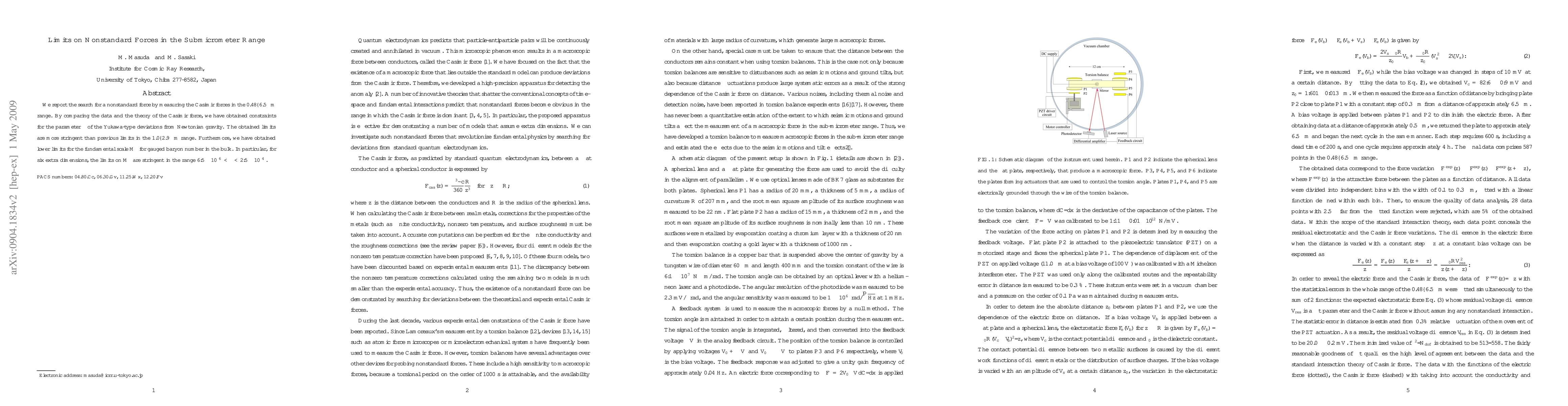 We report the search for a nonstandard force by measuring the Casimir forces in the 0.48--6.5 $\mu$m range. By comparing the data and the theory of the Casimir force, we have obtained constraints for the parameter $\alpha$ of the Yukawa-type deviations from Newtonian gravity. The obtained limits are more stringent than previous limits in the 1.0--2.9 $\mu$m range. Furthermore, we have obtained lower limits for the fundamental scale $M_{*}$ for gauged baryon number in the bulk. In particular, for six extra dimensions, the limits on $M_{*}$ are stringent in the range $6.5\times10^{-6}<\rho<2.5\times10^{-4}$.