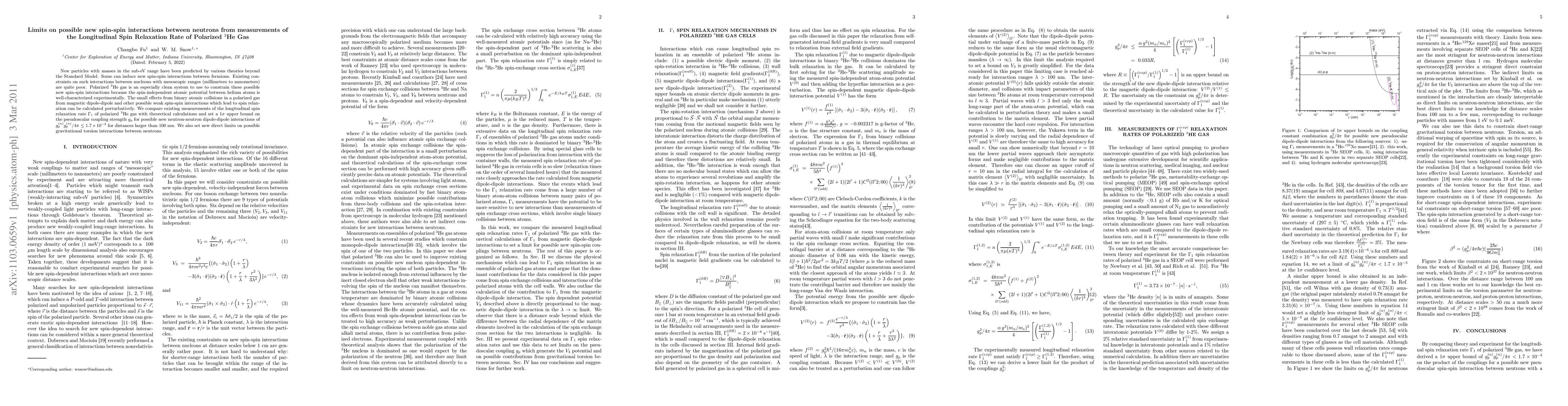 New particles with masses in the sub-eV range have been predicted by various theories beyond the Standard Model. Some can induce new spin-spin interactions between fermions. Existing constraints on such interactions between nucleons with mesoscopic ranges (millimeters to nanometers) are quite poor. Polarized $^{3}$He gas is an especially clean system to use to constrain these possible new spin-spin interactions because the spin-independent atomic potential between helium atoms is well-characterized experimentally. The small effects from binary atomic collisions in a polarized gas from magnetic dipole-dipole and other possible weak spin-spin interactions which lead to spin relaxation can be calculated perturbatively. We compare existing measurements of the longitudinal spin relaxation rate $\Gamma_{1}$ of polarized $^3$He gas with theoretical calculations and set a $1\sigma$ upper bound on the pseudoscalar coupling strength $g_p$ for possible new neutron-neutron dipole-dipole interactions of $g_p^{(n)}g_p^{(n)}/4\pi \le 1.7\times 10^{-3}$ for distances larger than 100 nm. We also set new direct limits on possible gravitational torsion interactions between neutrons.
