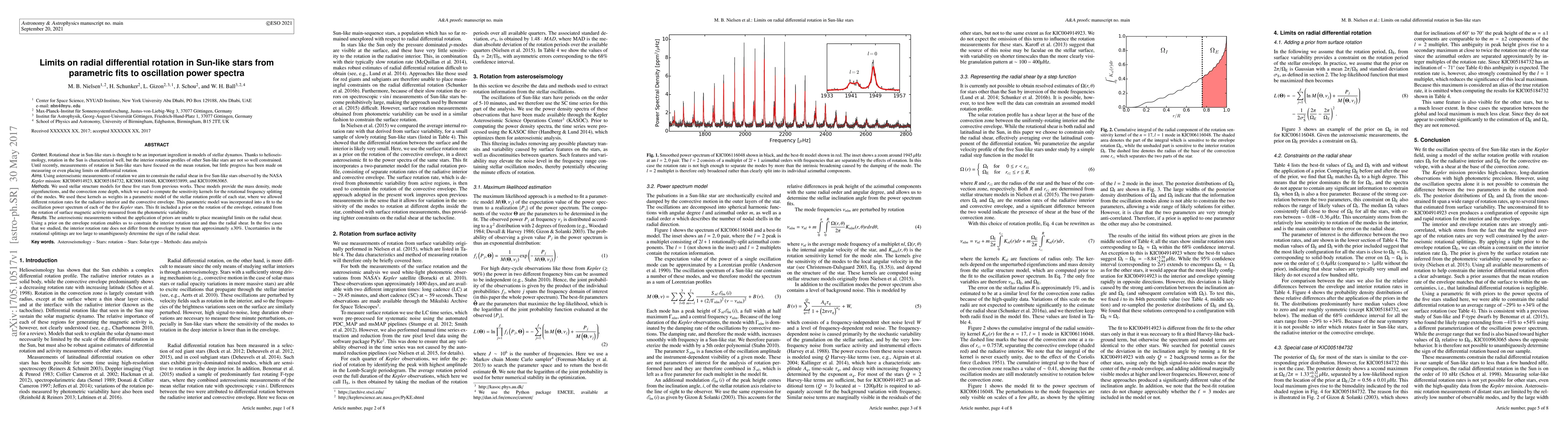 Rotational shear in Sun-like stars is thought to be an important ingredient in models of stellar dynamos. Thanks to helioseismology, rotation in the Sun is characterized well, but the interior rotation profiles of other Sun-like stars are not so well constrained. Until recently, measurements of rotation in Sun-like stars have focused on the mean rotation, but little progress has been made on measuring or even placing limits on differential rotation. Using asteroseismic measurements of rotation we aim to constrain the radial shear in five Sun-like stars observed by the NASA Kepler mission: KIC004914923, KIC005184732, KIC006116048, KIC006933899, and KIC010963065. We used stellar structure models for these five stars from previous works. These models provide the mass density, mode eigenfunctions, and the convection zone depth, which we used to compute the sensitivity kernels for the rotational frequency splitting of the modes. We used these kernels as weights in a parametric model of the stellar rotation profile of each star, where we allowed different rotation rates for the radiative interior and the convective envelope. This parametric model was incorporated into a fit to the oscillation power spectrum of each of the five Kepler stars. This fit included a prior on the rotation of the envelope, estimated from the rotation of surface magnetic activity measured from the photometric variability. The asteroseismic measurements without the application of priors are unable to place meaningful limits on the radial shear. Using a prior on the envelope rotation enables us to constrain the interior rotation rate and thus the radial shear. In the five cases that we studied, the interior rotation rate does not differ from the envelope by more than approximately +/-30%. Uncertainties in the rotational splittings are too large to unambiguously determine the sign of the radial shear.