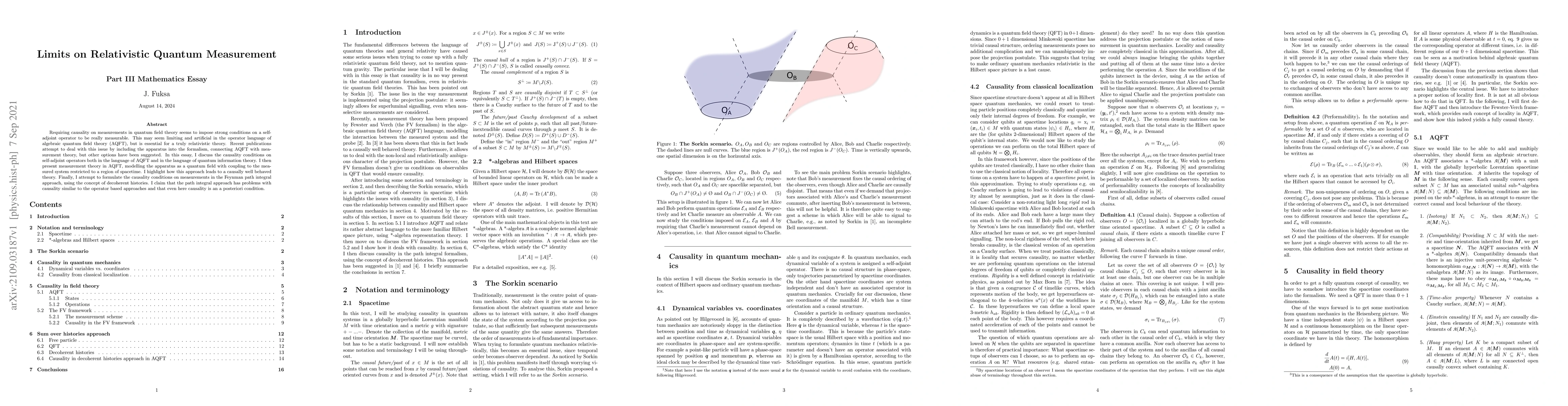 Requiring causality on measurements in quantum field theory seems to impose strong conditions on a self-adjoint operator to be really measurable. This may seem limiting and artificial in the operator language of algebraic quantum field theory (AQFT), but is essential for a truly relativistic theory. Recent publications attempt to deal with this issue by including the apparatus into the formalism, connecting AQFT with measurement theory, but other options have been suggested. In this essay, I discuss the causality conditions on self-adjoint operators both in the language of AQFT and in the language of quantum information theory. I then present measurement theory in AQFT, modelling the apparatus as a quantum field with coupling to the measured system restricted to a region of spacetime. I highlight how this approach leads to a causally well behaved theory. Finally, I attempt to formulate the causality conditions on measurements in the Feynman path integral approach, using the concept of decoherent histories. I claim that the path integral approach has problems with causality similar to the operator based approaches and that even here causality is an a posteriori condition.