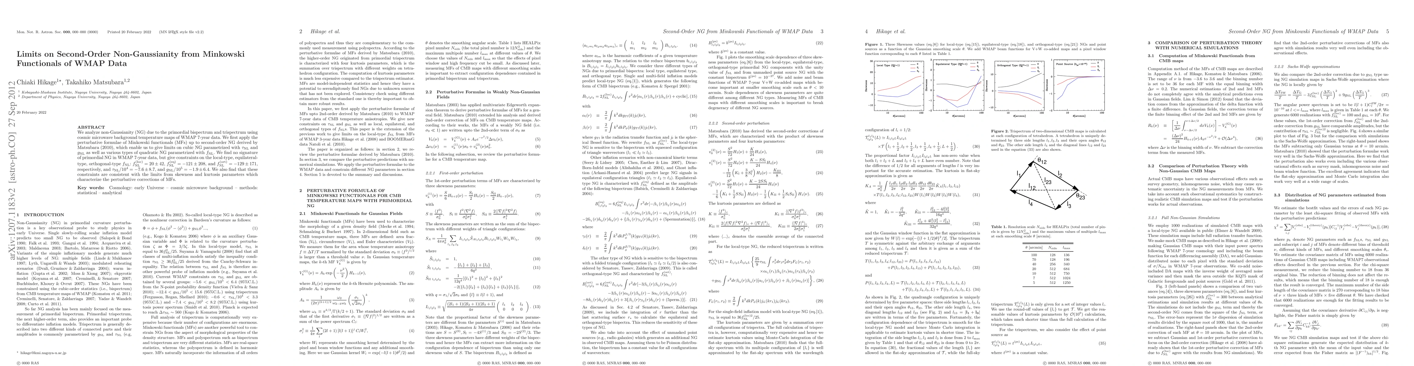 This paper analyzes non-Gaussianity in the WMAP 7-year data using Minkowski functionals to derive limits on second-order non-Gaussianity parameters. No evidence of primordial non-Gaussianity is found, but constraints on various f_NL types and tau_NL/g_NL are provided.