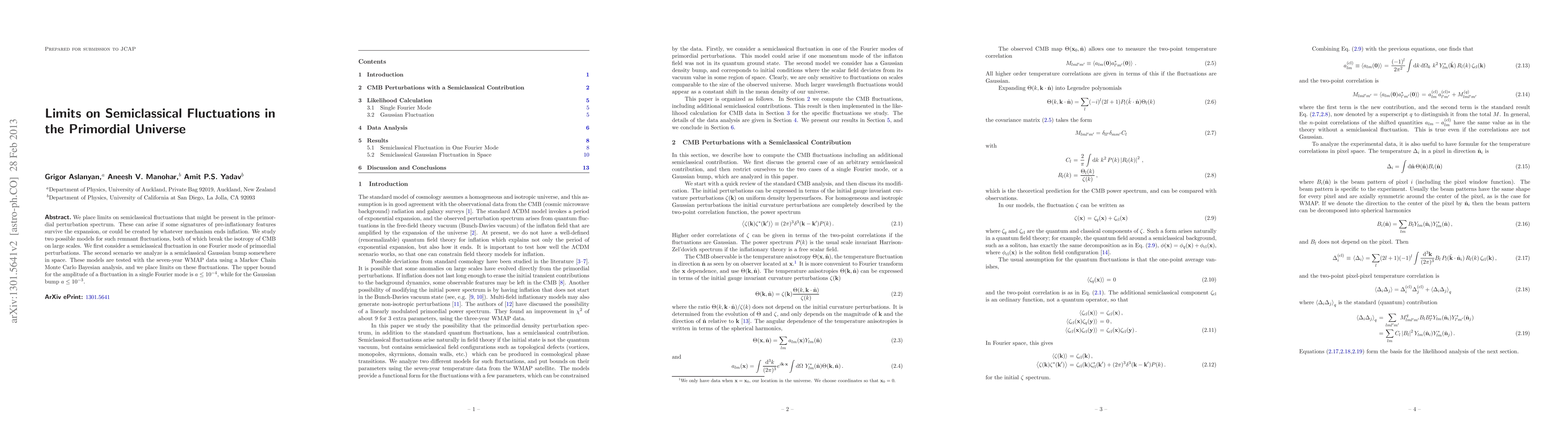 This research sets limits on semiclassical fluctuations in the primordial universe, testing two models via seven-year WMAP data. It finds an upper bound of a<=10^(-4) for a fluctuation in a single Fourier mode and a<=10^(-3) for a Gaussian bump, implying constraints on potential pre-inflationary features or inflation-ending mechanisms.