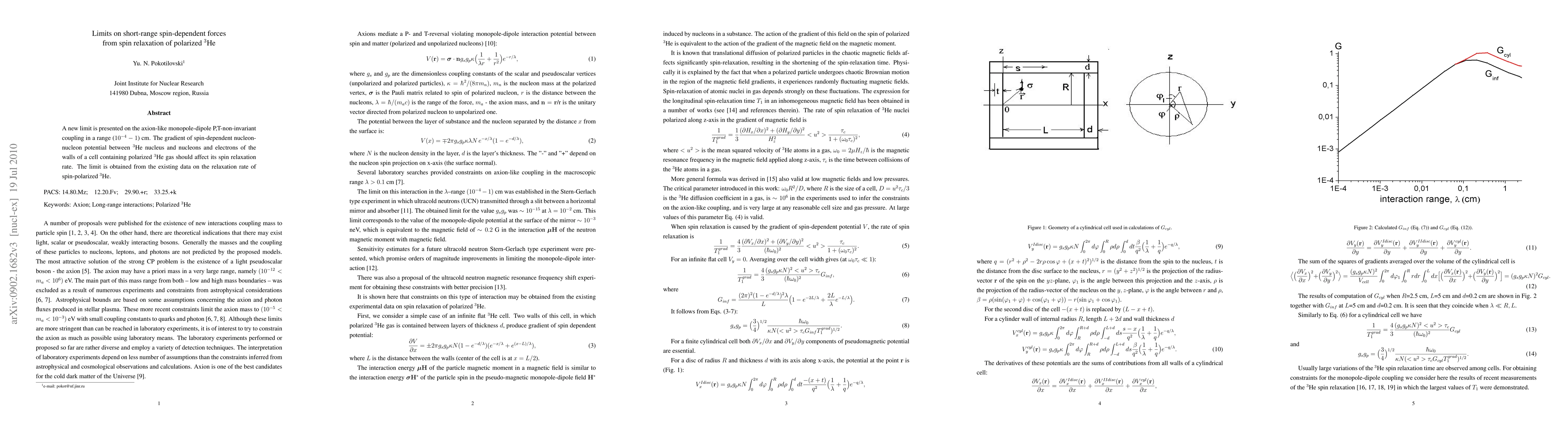 A new limit is presented on the axionlike P,T-noninvariant monopole-dipole coupling in a range (10^{-4} - 1) cm from existing data on the relaxation of spin-polarized He-3.