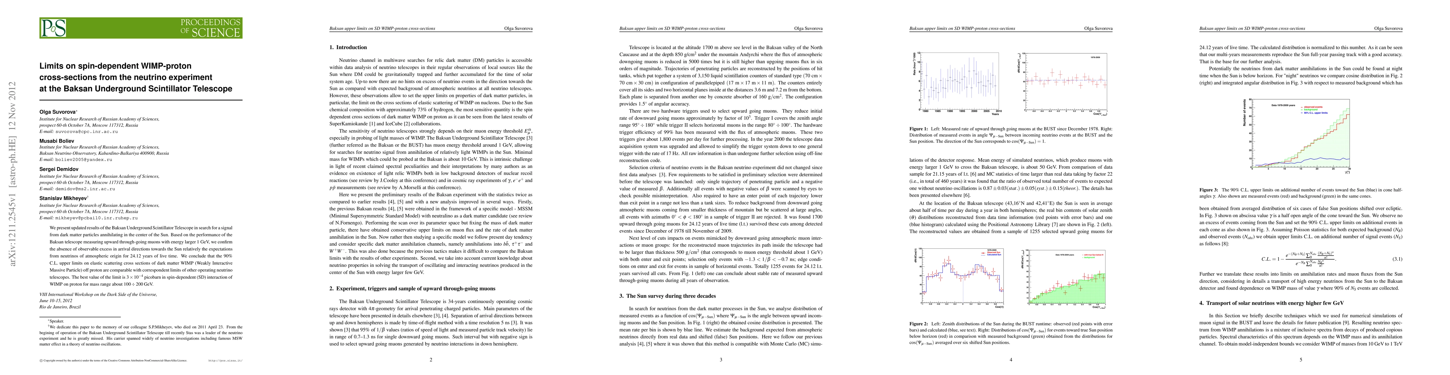 The Baksan Underground Scintillator Telescope has found no excess signal from dark matter WIMPs in the Sun, setting a 90% C.L. upper limit of $3 \times 10^{-4}$ picobarn for spin-dependent WIMP-proton interactions over 24.12 years of data. These limits are comparable to those from other neutrino telescopes.
