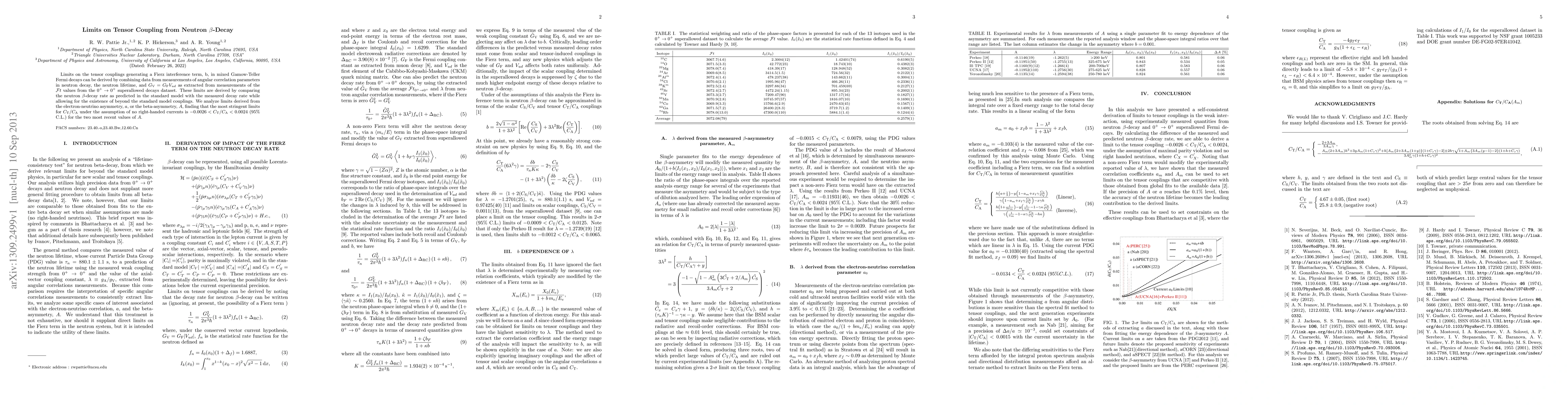 Limits on the tensor couplings generating a Fierz interference term, b, in mixed Gamow-Teller Fermi decays can be derived by combining data from measurements of angular correlation parameters in neutron decay, the neutron lifetime, and $G_{\text{V}}=G_{\text{F}} V_{ud}$ as extracted from measurements of the $\mathcal{F}t$ values from the $0^{+} \to 0^{+}$ superallowed decays dataset. These limits are derived by comparing the neutron $\beta$-decay rate as predicted in the standard model with the measured decay rate while allowing for the existence of beyond the standard model couplings. We analyze limits derived from the electron-neutrino asymmetry, $a$, or the beta-asymmetry, $A$, finding that the most stringent limits for $C_\text{T}/C_\text{A}$ under the assumption of no right-handed currents is $-0.0026 < C_\text{T}/C_\text{A} < 0.0024$ (95% C.L.) for the two most recent values of $A$.