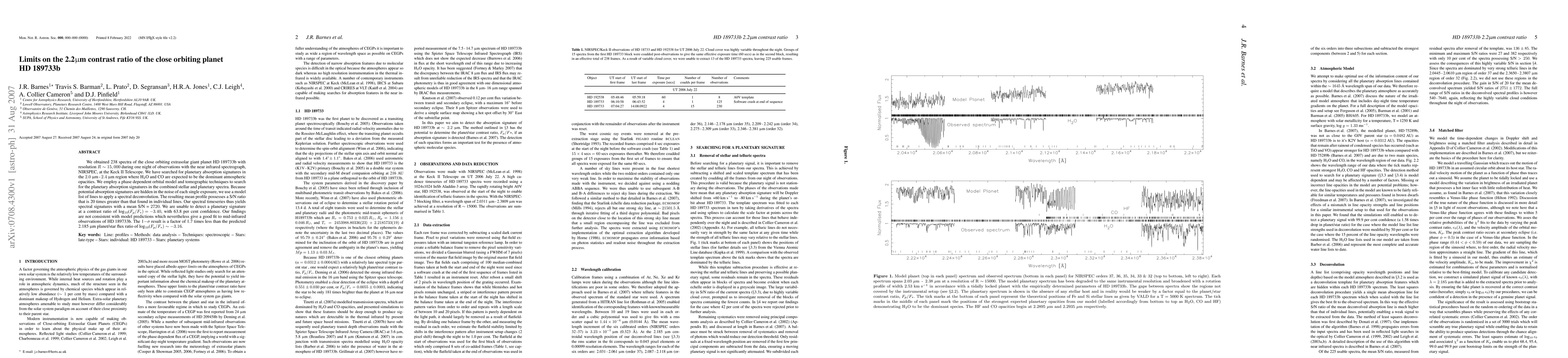 This paper reports on observations of the exoplanet HD 189733b using NIRSPEC at the Keck II Telescope, finding no detectable absorption signatures in the 2.0-2.4 micron region despite high spectral resolution. The study concludes that the planet's contrast ratio is at least a factor of 1.7 less than predicted models, challenging existing atmospheric models.