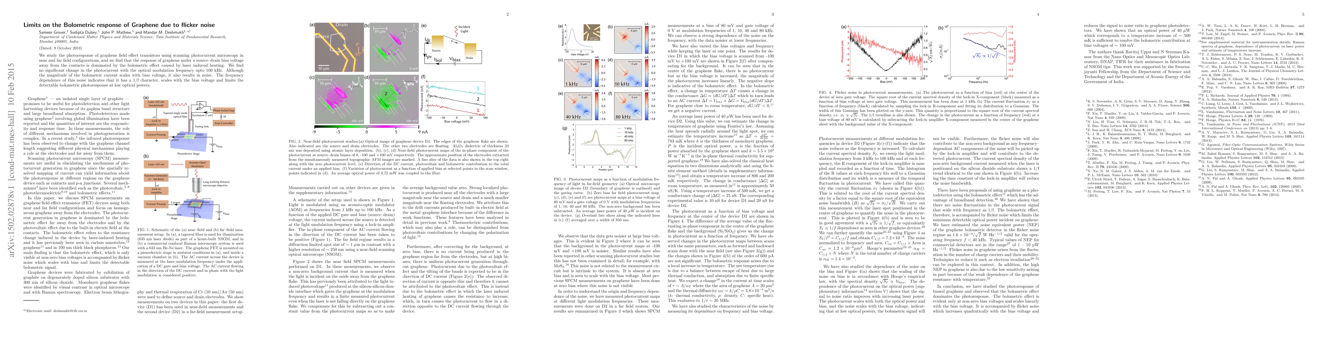 We study the photoresponse of graphene field effect transistors using scanning photocurrent microscopy in near and far field configurations, and we find that the response of graphene under a source-drain bias voltage away from the contacts is dominated by the bolometric effect caused by laser induced heating. We find no significant change in the photocurrent with the optical modulation frequency upto 100 kHz. Although the magnitude of the bolometric current scales with bias voltage, it also results in noise. The frequency dependence of this noise indicates that it has a 1/f character, scales with the bias voltage and limits the detectable bolometric photoresponse at low optical powers.