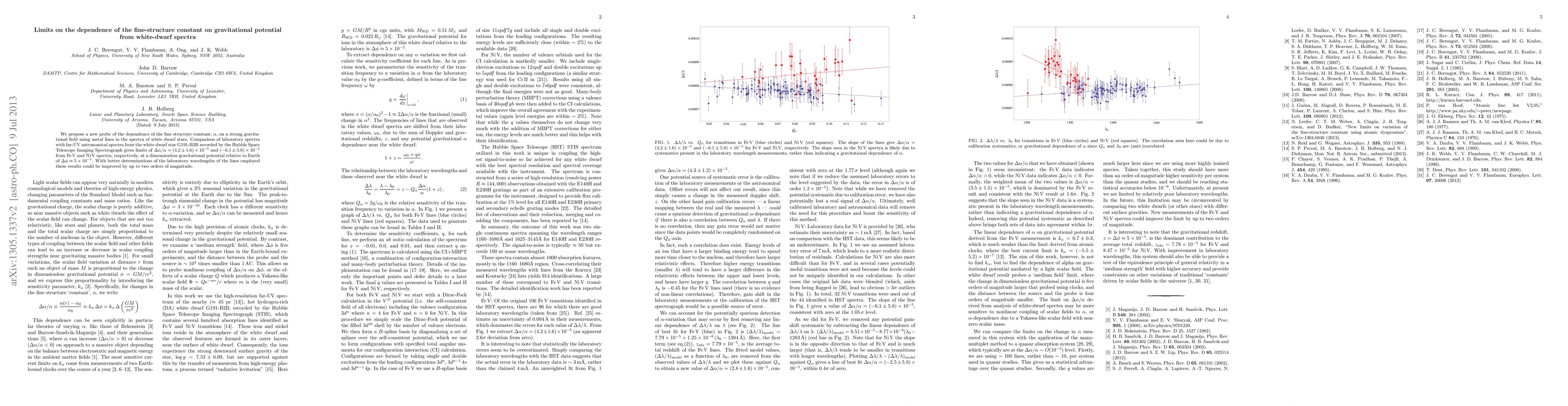 This paper investigates the dependence of the fine-structure constant, alpha, on gravitational potential using white dwarf spectra, finding a fractional variation of (Delta alpha/alpha) = (4.2 ± 1.6)x10^(-5) from Fe V and (-6.1 ± 5.8)x10^(-5) from Ni V lines. Future improvements in laboratory wavelength measurements could enhance these limits by two orders of magnitude.