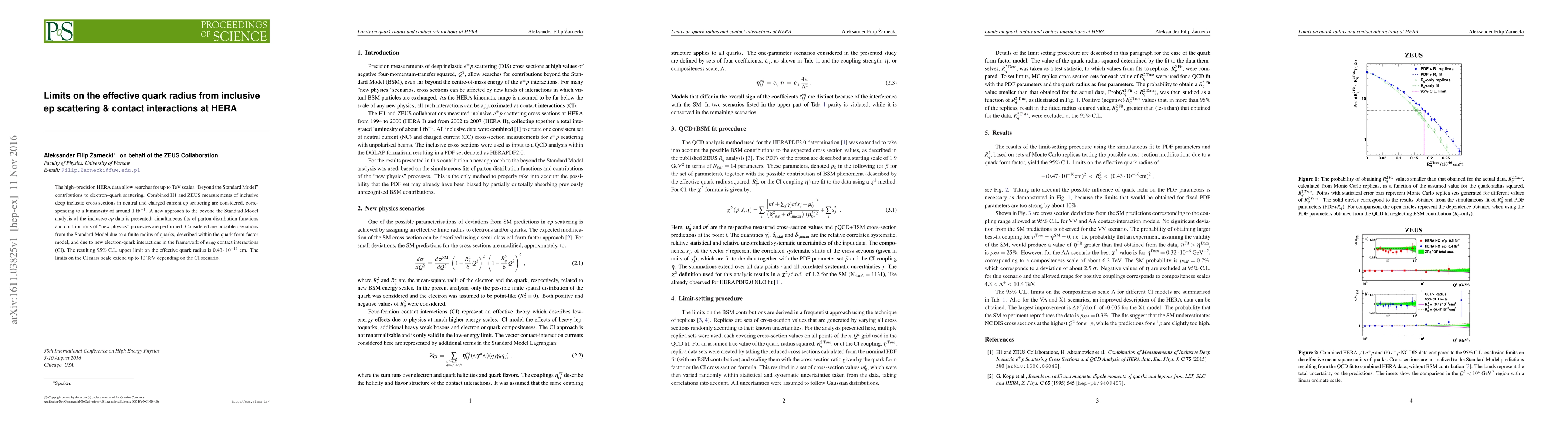 This paper uses HERA data to search for "Beyond the Standard Model" contributions in electron-proton scattering, focusing on finite quark radius and contact interactions. The study sets a 95% C.L. upper limit on the effective quark radius of $0.43\cdot 10^{-16}$ cm and limits on the mass scale of contact interactions up to 10 TeV.