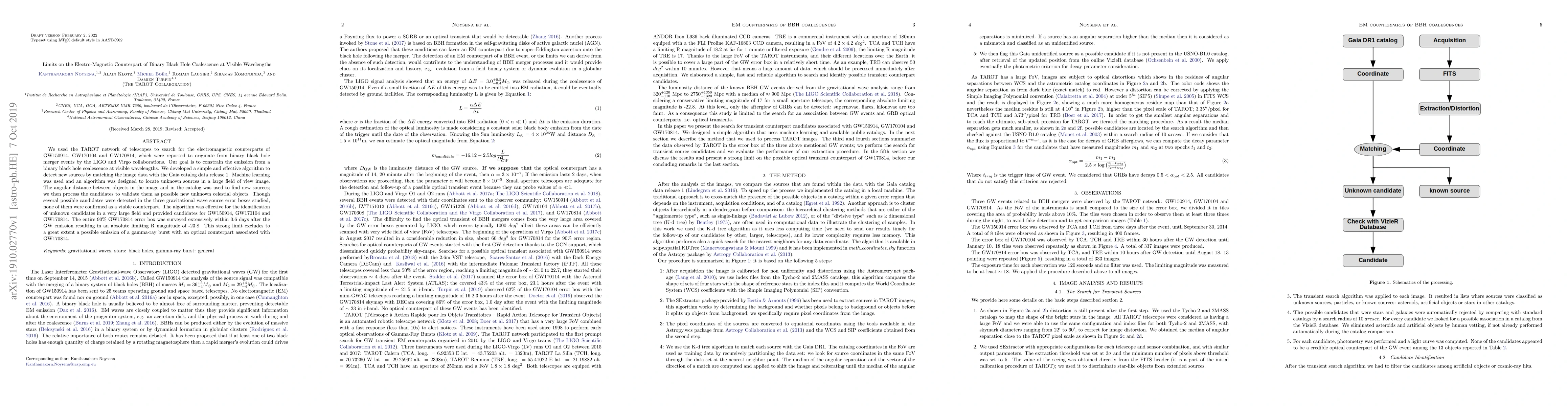 We used the TAROT network of telescopes to search for the electromagnetic counterparts of GW150914, GW170104 and GW170814, which were reported to originate from binary black hole merger events by the LIGO and Virgo collaborations. Our goal is to constrain the emission from a binary black hole coalescence at visible wavelengths. We developed a simple and effective algorithm to detect new sources by matching the image data with the Gaia catalog data release 1. Machine learning was used and an algorithm was designed to locate unknown sources in a large field of view image. The angular distance between objects in the image and in the catalog was used to find new sources; we then process the candidates to validate them as possible new unknown celestial objects. Though several possible candidates were detected in the three gravitational wave source error boxes studied, none of them were confirmed as a viable counterpart. The algorithm was effective for the identification of unknown candidates in a very large field and provided candidates for GW150914, GW170104 and GW170814. The entire 90\% GW170814 error box was surveyed extensively within 0.6 days after the GW emission resulting in an absolute limiting R magnitude of -23.8. This strong limit excludes to a great extent a possible emission of a gamma-ray burst with an optical counterpart associated with GW170814.