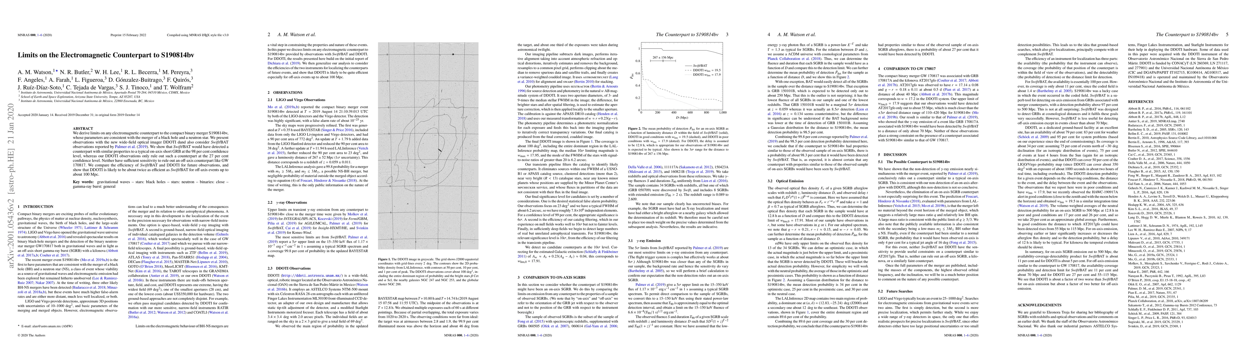 We derive limits on any electromagnetic counterpart to the compact binary merger S190814bv, whose parameters are consistent with the merger of a black hole and a neutron star. We present observations with the new wide-field optical imager DDOTI and also consider Swift/BAT observations reported by Palmer et al. (2019). We show that Swift/BAT would have detected a counterpart with similar properties to a typical on-axis short GRB at the 98 per cent confidence level, whereas our DDOTI observations only rule out such a counterpart at the 27 per cent confidence level. Neither have sufficient sensitivity to rule out an off-axis counterpart like GW 170817. We compare the efficiency of Swift/BAT and DDOTI for future observations, and show that DDOTI is likely to be about twice as efficient as Swift/BAT for off-axis events up to about 100 Mpc.