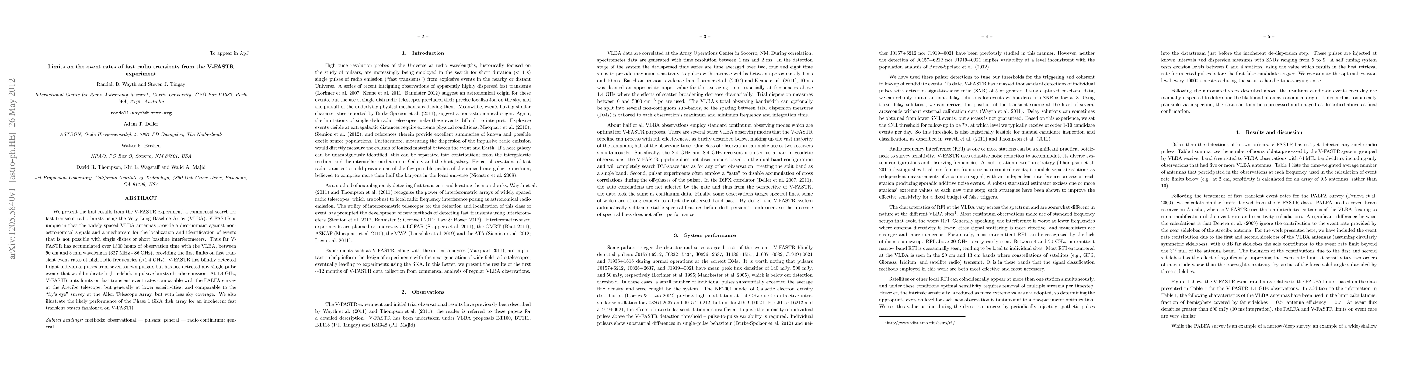 The V-FASTR experiment, using the VLBA, sets new limits on the event rates of fast radio transients at high radio frequencies (>1.4 GHz). Despite detecting bright pulses from known pulsars, no single-pulse events from high redshift sources were found, providing constraints on transient event rates comparable to other surveys.
