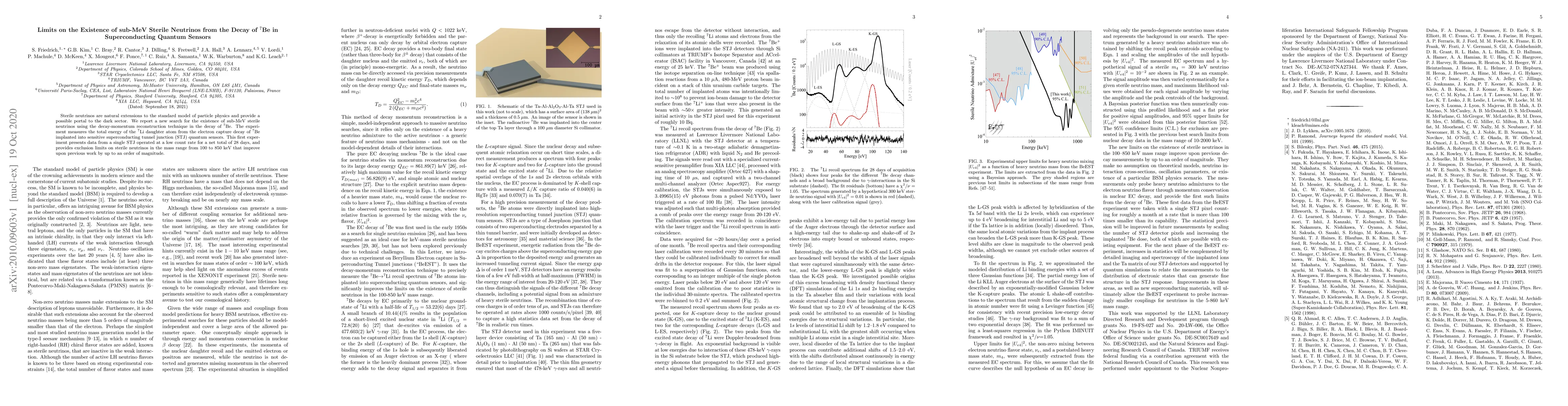 Sterile neutrinos are natural extensions to the standard model of particle physics and provide a possible portal to the dark sector. We report a new search for the existence of sub-MeV sterile neutrinos using the decay-momentum reconstruction technique in the decay of $^7$Be. The experiment measures the total energy of the $^7$Li daughter atom from the electron capture decay of $^7$Be implanted into sensitive superconducting tunnel junction (STJ) quantum sensors. This first experiment presents data from a single STJ operated at a low count rate for a net total of 28 days, and provides exclusion limits on sterile neutrinos in the mass range from 100 to 850 keV that improve upon previous work by up to an order of magnitude.