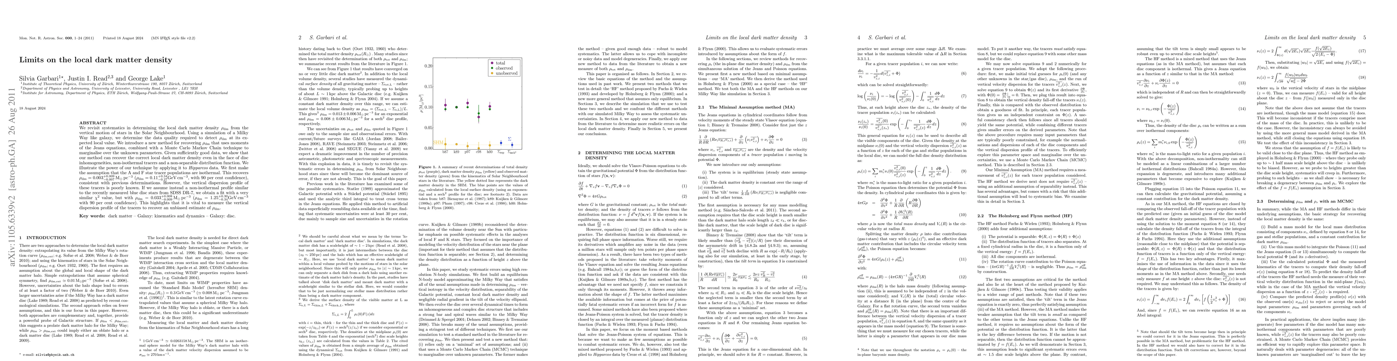 We revisit systematics in determining the local dark matter density (rho_dm) from the vertical motion of stars in the Solar Neighbourhood. Using a simulation of a Milky Way-like galaxy, we determine the data-quality required to detect the dark matter density at its expected local value. We introduce a new method for recovering rho_dm that uses moments of the Jeans equations, combined with a Monte Carlo Markov Chain technique to marginalise over the unknown parameters. Given sufficiently good data, we show that our method can recover the correct local dark matter density even in the face of disc inhomogeneities, non-isothermal tracers and a non-separable distribution function. We illustrate the power of our technique by applying it to Hipparcos data [Holmberg & Flynn 2000,2004]. We first make the assumption that the A and F star tracer populations are isothermal. This recovers rho_dm=0.003^{+0.009}_{-0.007}Msun/pc^3 (with 90 per cent confidence), consistent with previous determinations. However, the vertical dispersion profile of these tracers is poorly known. If we assume instead a non-isothermal profile similar to the blue disc stars from SDSS DR-7 [Abazajian et al. 2009] measured by Bond et al. (2009), we obtain a fit with a very similar chi^2 value, but with rho_dm=0.033^{+0.008}_{-0.009}Msun/pc^3 (with 90 per cent confidence). This highlights that it is vital to measure the vertical dispersion profile of the tracers to recover an unbiased estimate of the local dark matter density.