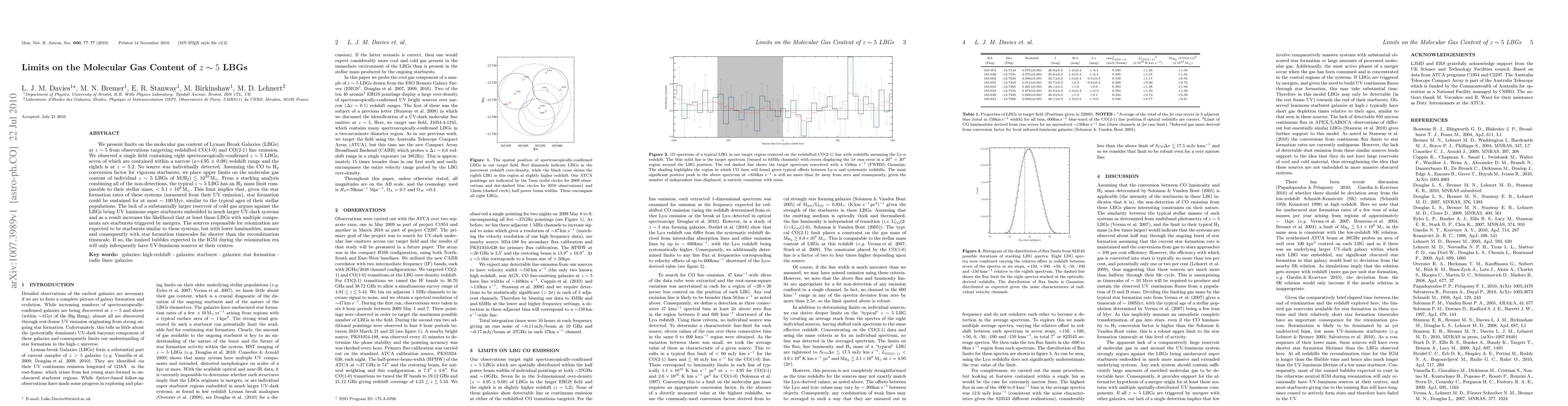 We present limits on the molecular gas content of Lyman Break Galaxies (LBGs) at z~5 from observations targetting redshifted CO(1-0) and CO(2-1) line emission. We observed a single field containing eight spectroscopically-confirmed z~5 LBGs, seven of which are contained within a narrow (z=4.95\pm 0.08) redshift range and the eighth is at z=5.2. No source was individually detected. Assuming the CO to H2 conversion factor for vigorous starbursts, we place upper limits on the molecular gas content of individual z~5 LBGs of M(H2)<~10^10 Msun. From a stacking analysis combining all of the non-detections, the typical z~5 LBG has an H2 mass limit comparable to their stellar mass, < 3.1 x 10^9 Msun. This limit implies that, given the star formation rates of these systems (measured from their UV emission), star formation could be sustained for at most ~100Myr, similar to the typical ages of their stellar populations. The lack of a substantially larger reservoir of cold gas argues against the LBGs being UV luminous super starbursts embedded in much larger UV-dark systems and as a result increases the likelihood that at least those LBGs with multiple components are starbursts triggered by mergers. The sources responsible for reionization are expected to be starbursts similar to these systems, but with lower luminosities, masses and consequently with star formation timescales far shorter than the recombination timescale. If so, the ionized bubbles expected in the IGM during the reionization era will infrequently have UV-luminous sources at their centres.