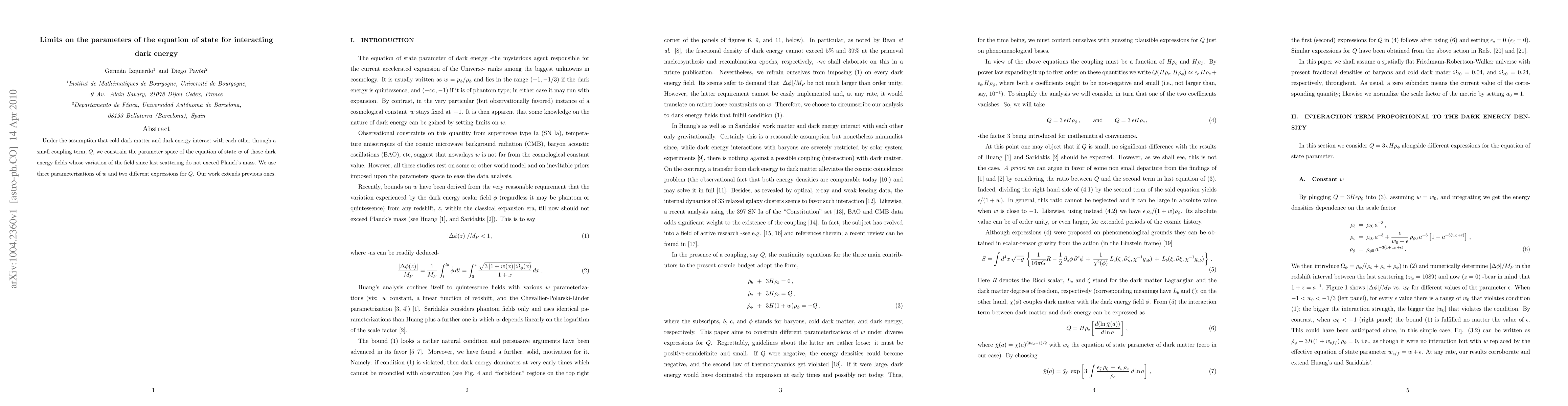 Under the assumption that cold dark matter and dark energy interact with each other through a small coupling term, $Q$, we constrain the parameter space of the equation of state $w$ of those dark energy fields whose variation of the field since last scattering do not exceed Planck's mass. We use three parameterizations of $w$ and two different expressions for $Q$. Our work extends previous ones.