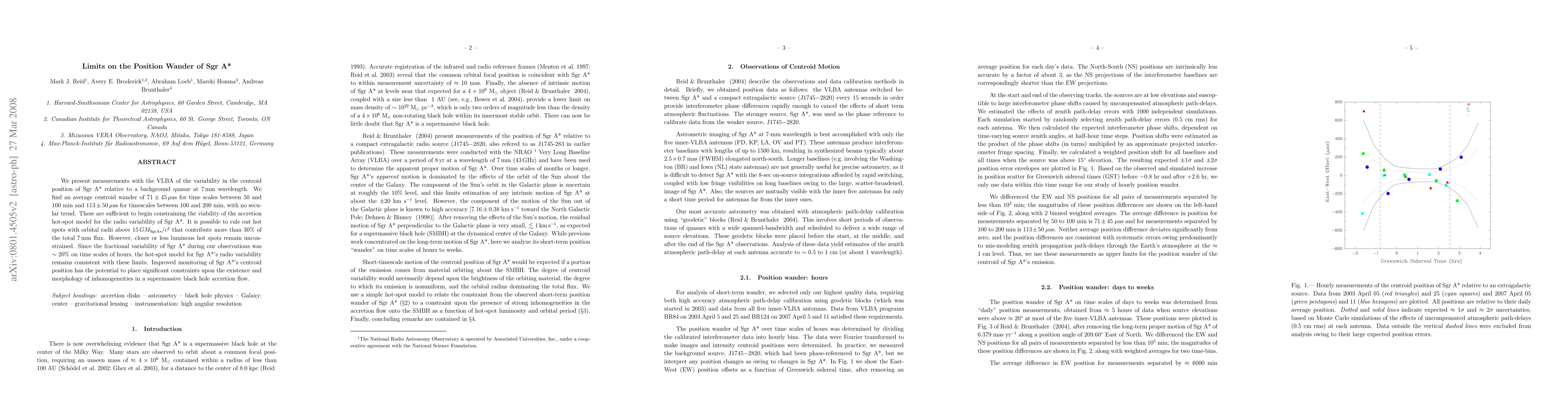 The study uses Very Long Baseline Array (VLBA) to measure Sgr A*'s position variability at 7-mm wavelength, finding average wander of 71 ± 45 µarcsec over 50-100 min and 113 ± 50 µarcsec over 100-200 min, with no discernible trend. These findings help constrain the 'hot-spot' model for Sgr A*'s radio variability, ruling out hot spots with radii >15 times the Schwarzschild radius contributing >30% of 7-mm flux, while closer or less luminous hot spots remain unconstrained. The research highlights the potential of improved monitoring for constraining inhomogeneities in supermassive black hole accretion flows.