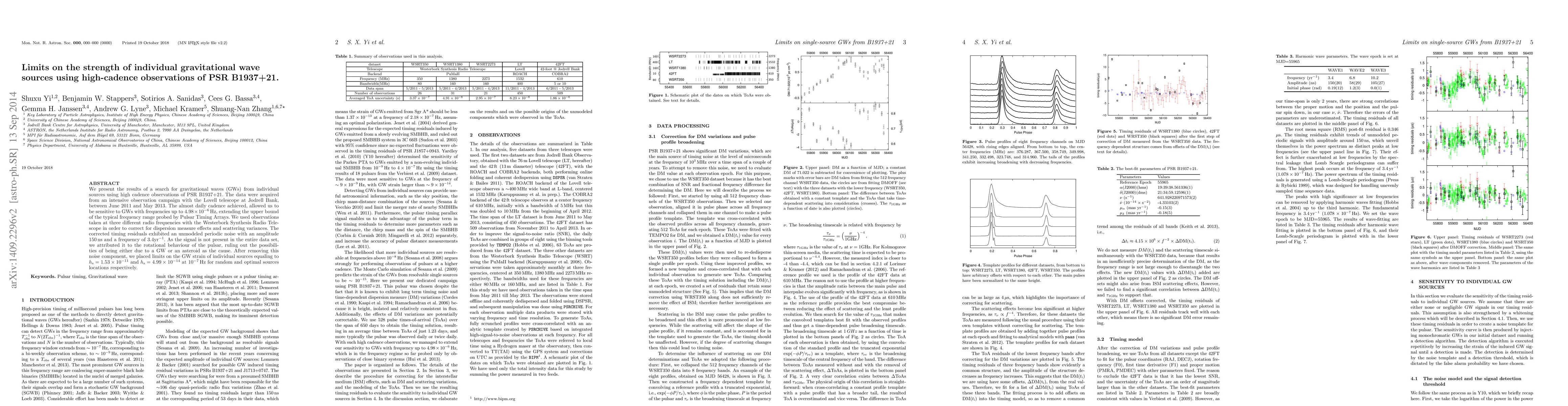 We present the results of a search for gravitational waves (GWs) from individual sources using high cadence observations of PSR B1937+21. The data were acquired from an intensive observation campaign with the Lovell telescope at Jodrell Bank, between June 2011 and May 2013. The almost daily cadence achieved, allowed us to be sensitive to GWs with frequencies up to $4.98\times10^{-6}\,\rm {Hz}$, extending the upper bound of the typical frequency range probed by Pulsar Timing Arrays. We used observations taken at three different radio frequencies with the Westerbork Synthesis Radio Telescope in order to correct for dispersion measure effects and scattering variances. The corrected timing residuals exhibited an unmodeled periodic noise with an amplitude $~150\,\rm {ns}$ and a frequency of $3.4\rm {yr}^{-1}$. As the signal is not present in the entire data set, we attributed it to the rotational behaviour of the pulsar, ruling out the possibilities of being either due to a GW or an asteroid as the cause. After removing this noise component, we placed limits on the GW strain of individual sources equaling to $h_{\rm s}=1.53\times10^{-11}$ and $h_{\rm s}=4.99\times10^{-14}$ at $10^{-7}\,\rm {Hz}$ for random and optimal sources locations respectively.
