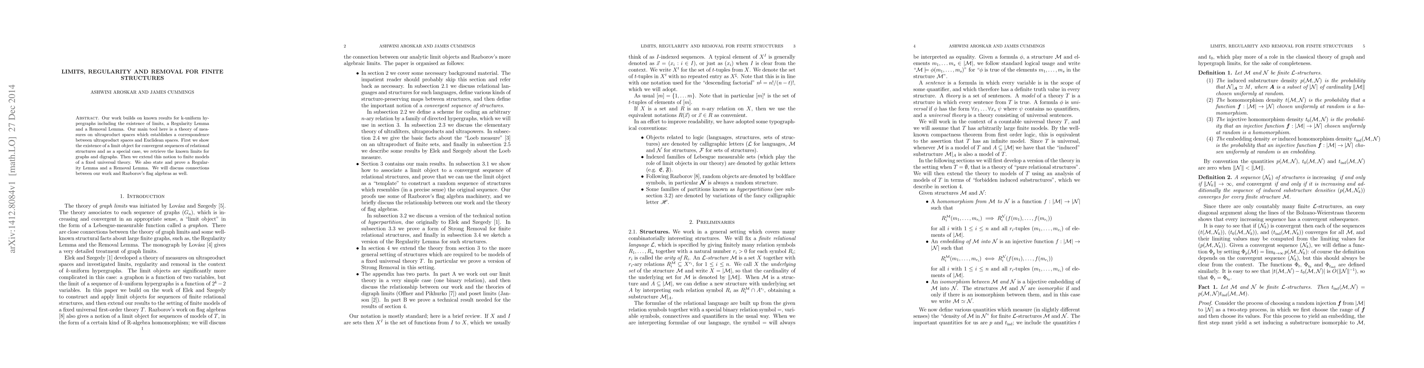 This paper establishes limits, Regularity Lemma, and Removal Lemma for finite structures, leveraging a theory of measures on ultraproduct spaces to connect them to Euclidean spaces.