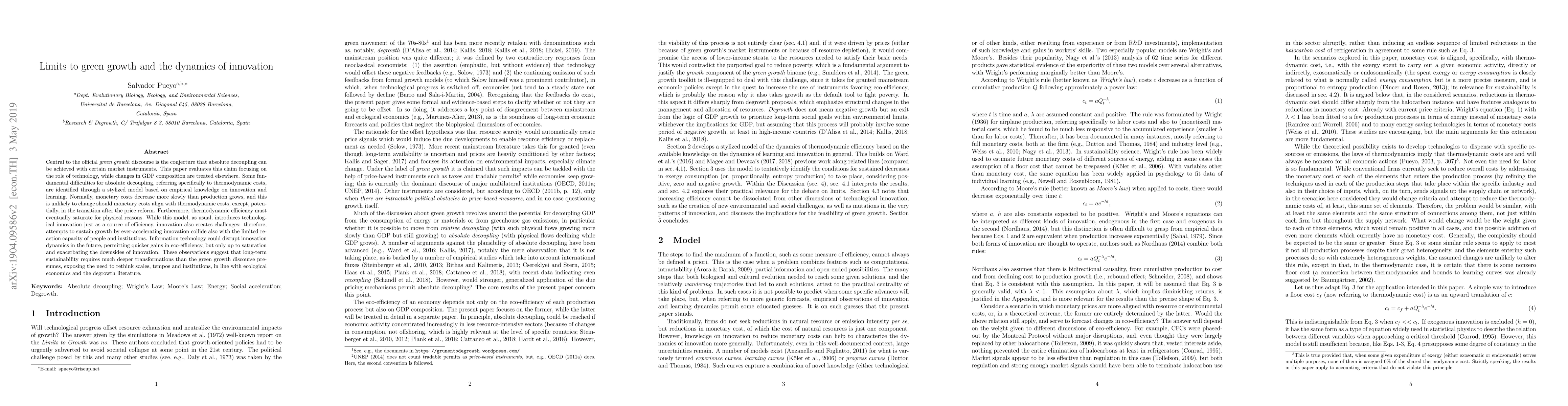This paper critiques the "green growth" notion of absolute decoupling through market instruments, highlighting thermodynamic constraints and the limitations of technological innovation. It concludes that deeper systemic transformations are necessary for long-term sustainability beyond mere technological fixes.